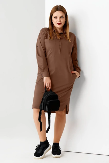 Молодежное платье из натуральной хлопковой ткани. Платье свободного кроя, с воротником, с застежкой на петли и пуговицы на планке, длиной до коленей. Рукава длинные втачные, по низу манжеты с петлями и пуговицами. В боковых швах и на груди карманы. Отличный вариант для отдыха и повседневных дней.