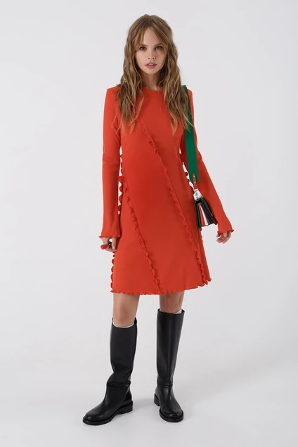 Трикотажное асимметричное мини-платье с оборками. Детали: прилегающий силуэт, круглая горловина переда и спинки, втачные длинные рукава с небольшим расширением по низу