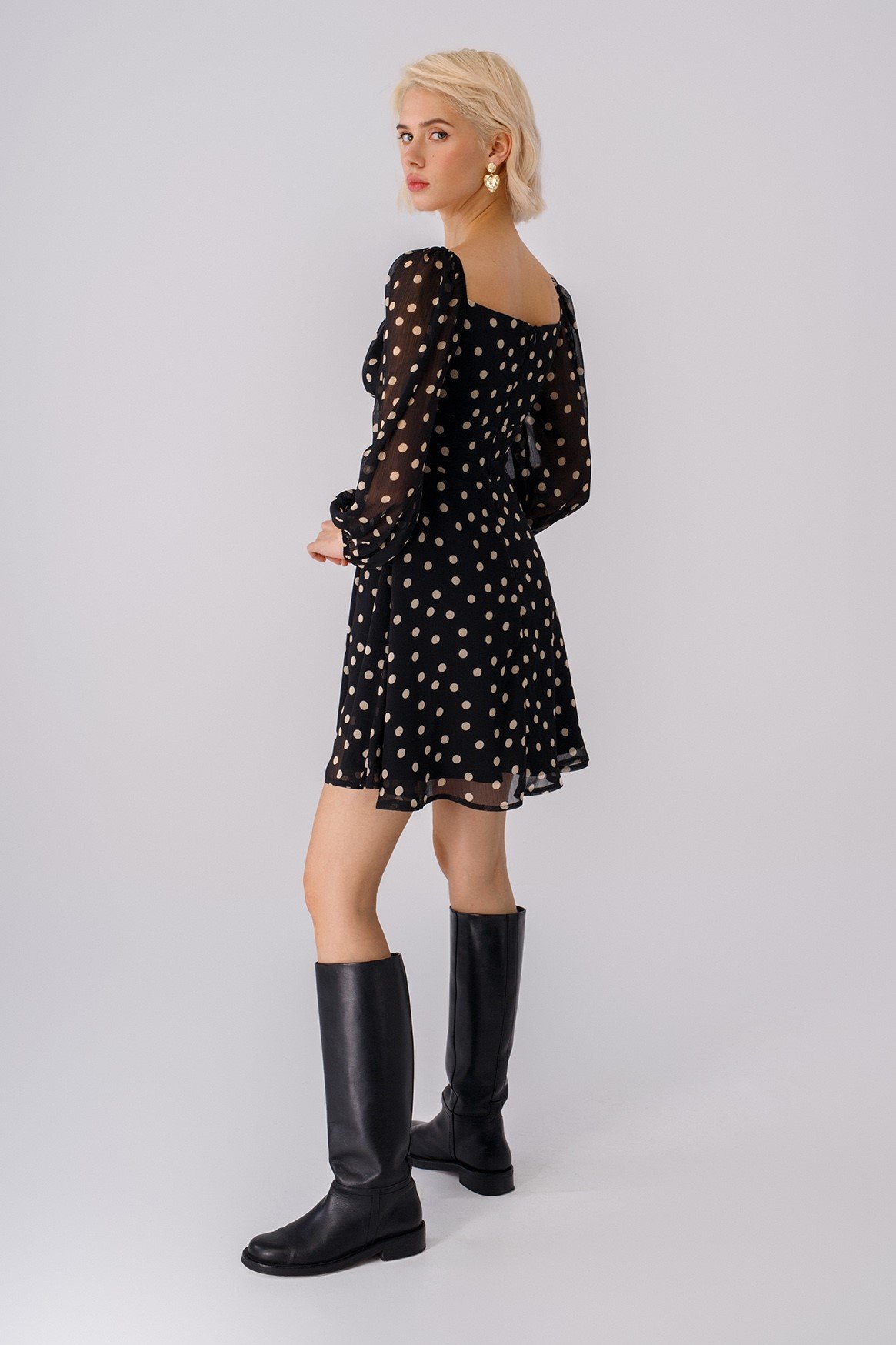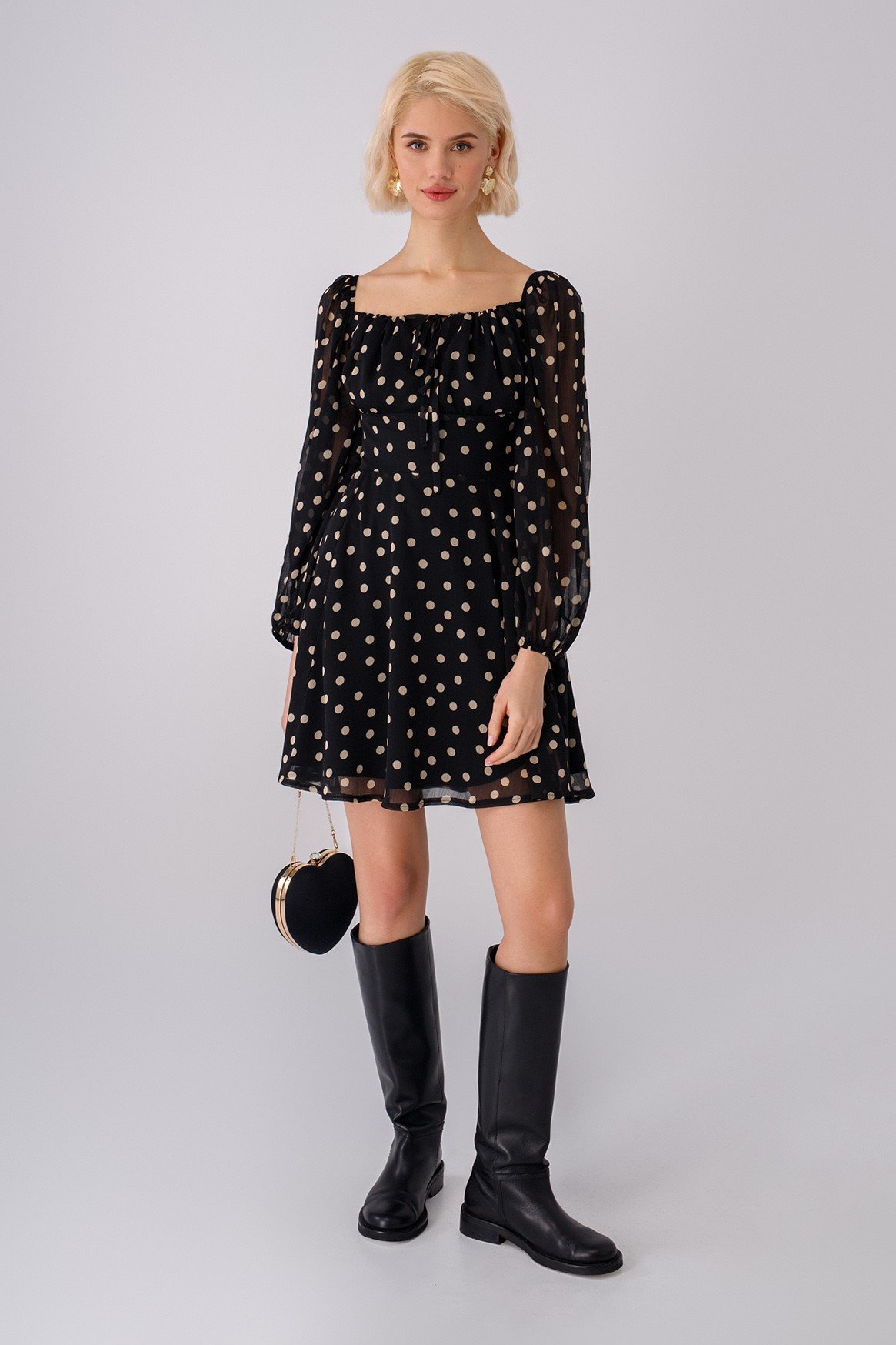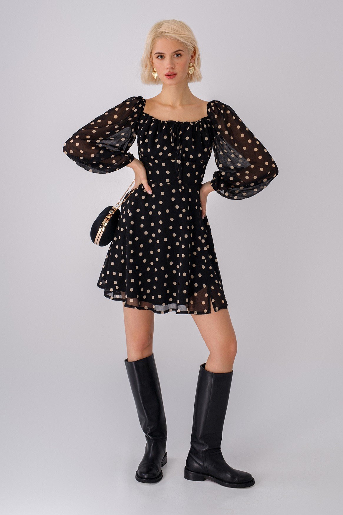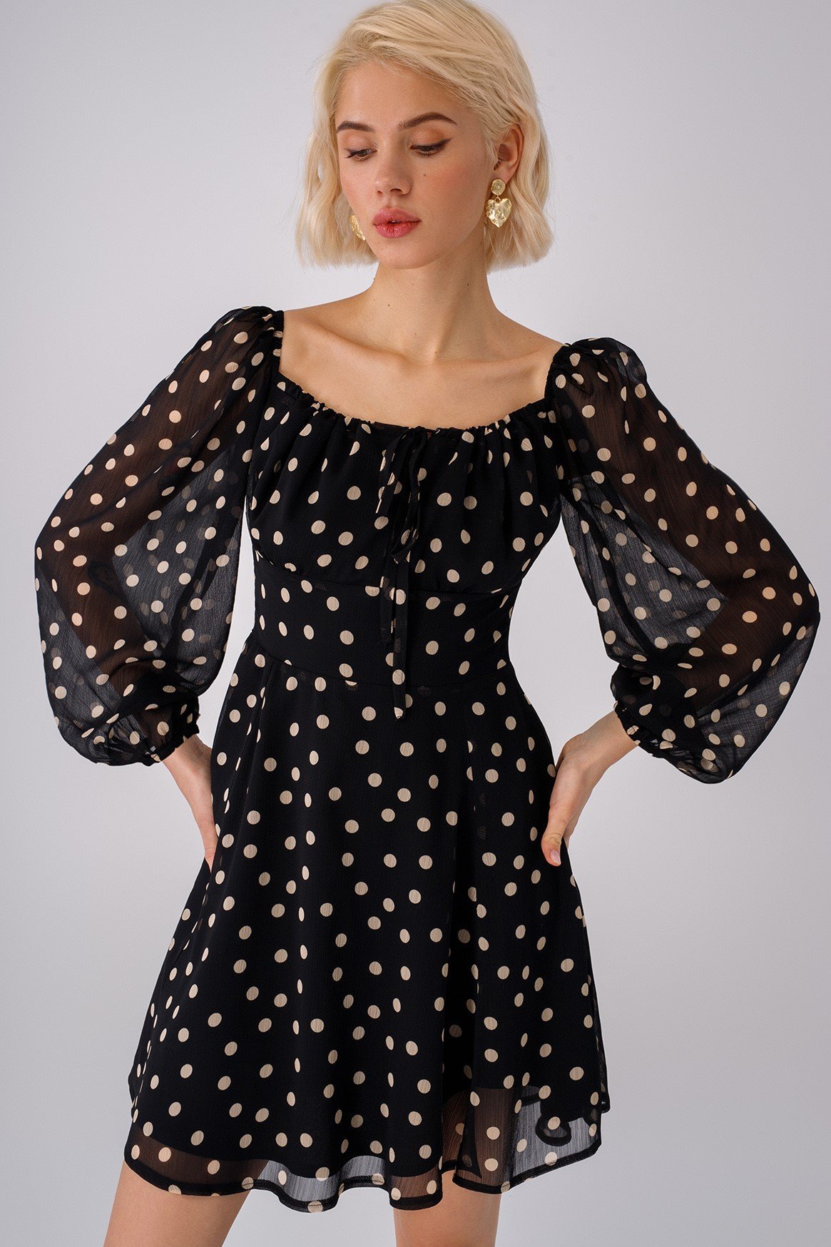 Мини- платье из струящегося текстиля с принтом. Детали: отрезная линия талии, вырез переда и спинки фигурной формы, спинка со средним швом и потайной застежкой-молнией, укороченные рукава с резинкой по низу, платье на подкладке