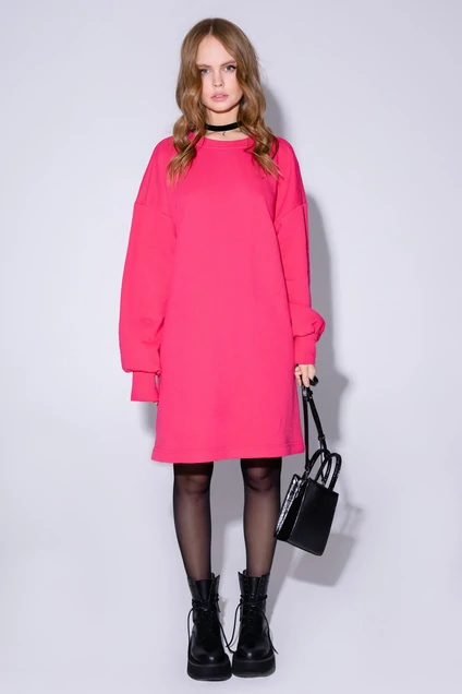 Свободное платье-свитшот из трикотажа. Детали: прямой силуэт, спущенная линия плеча, круглая горловина переда и спинки, длинные рукава со сборкой по низу и притачными манжетами, платье без застежки.
