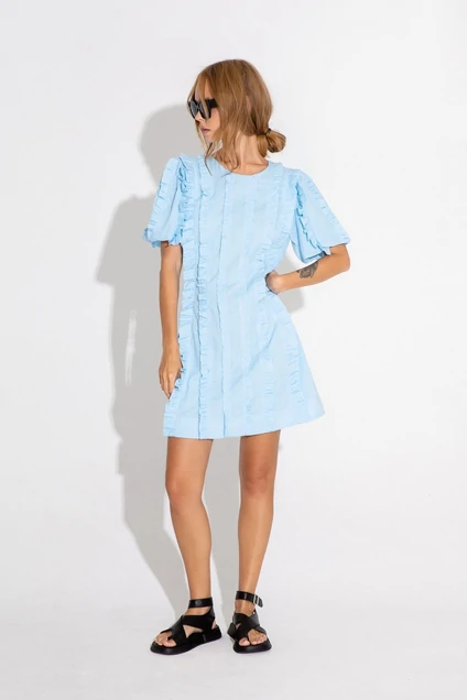 Детали: полуприлегающий силуэт, рельефные швы, потайная молния по спинке, короткие пышные рукава со сборкой, платье на подкладке