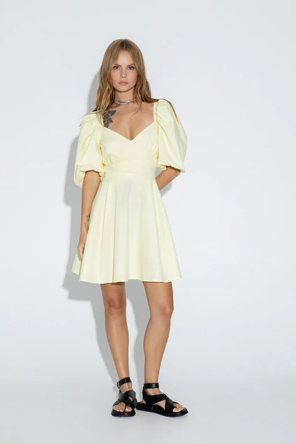 Детали: отрезная завышенная линия талии, лиф переда с драпировкой, глубокий вырез, пышные рукава, застежка на потайную молнию по спинке