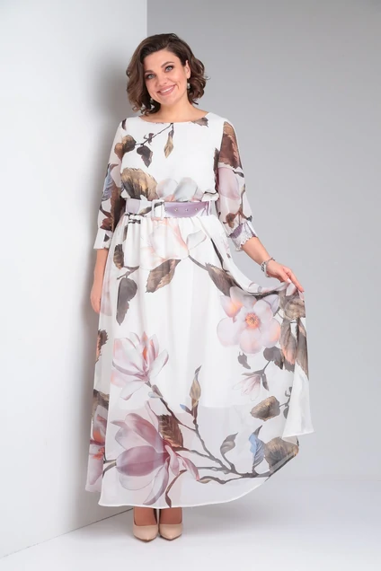 Платье женское отрезное по линии талии выполнено из легкой шифоновой ткани «премиум качества», на эластичной подкладке средней длины. Верх платья полуприлегающего силуэта, юбка расклешенная, полусолнце. Полочка с нагрудными выточками. Горловина «лодочка».