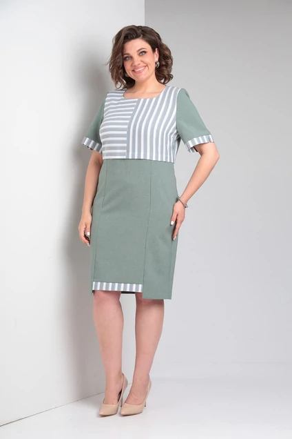 Платье женское полуприлегающего силуэта, длиной за колено.Платье отрезное по линии талии. Верх переда и спинки выполнен из ткани в полоску. Низ переда платья со сступенькой. Горловина без воротника, округая. Застежка на потайную тесьму-молнию в левом боковом шве. Рукав втачной, одно шовный,короткий, с манжетой. Длина платья 100см. Длина рукава 23см