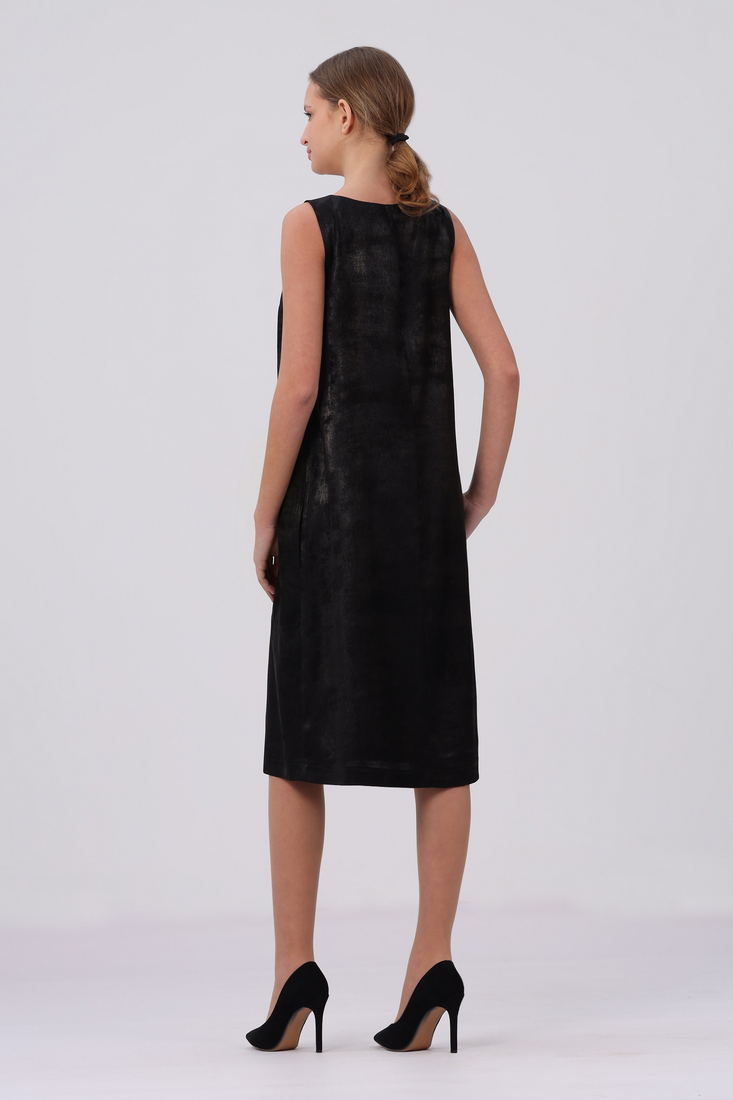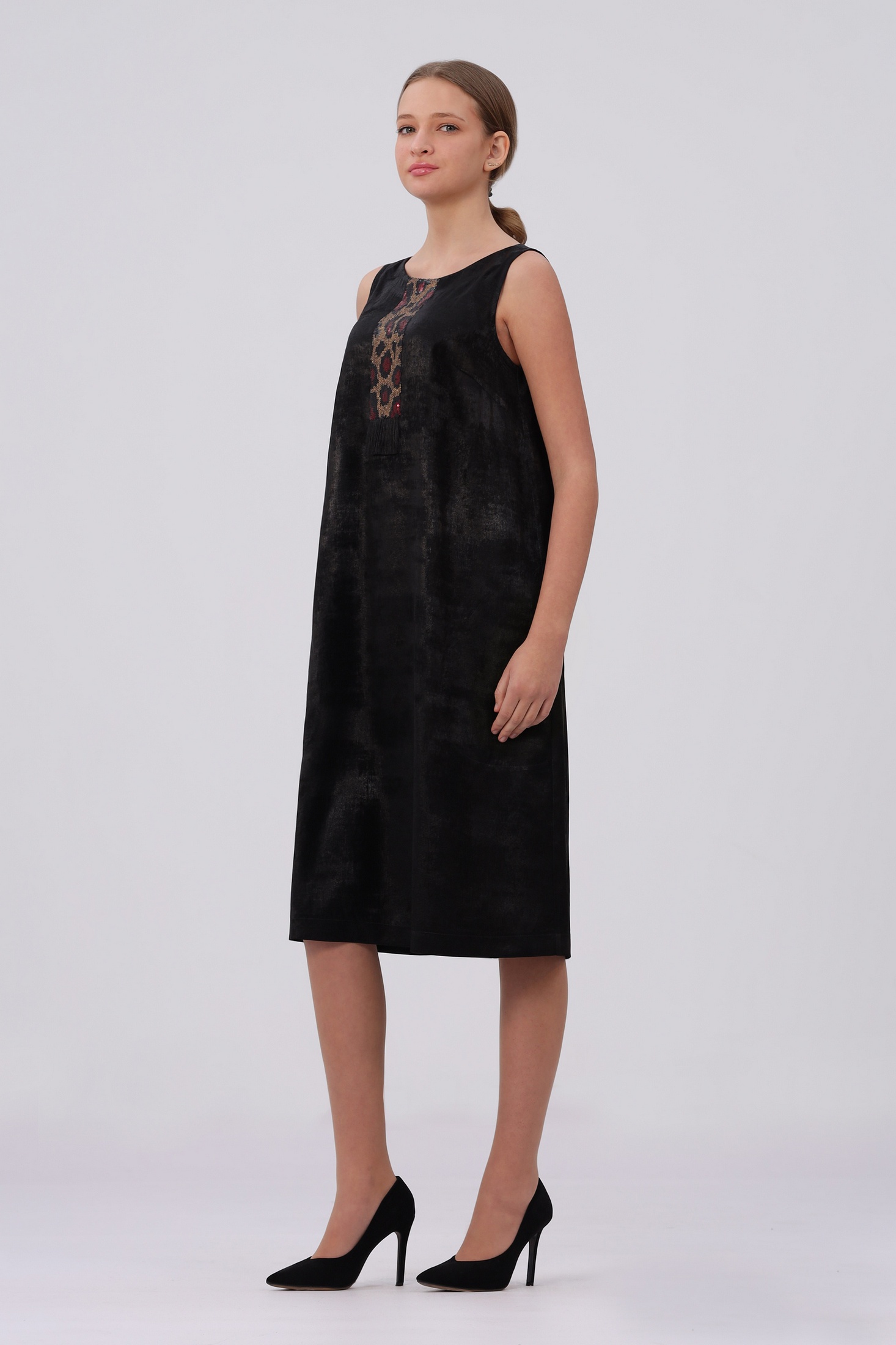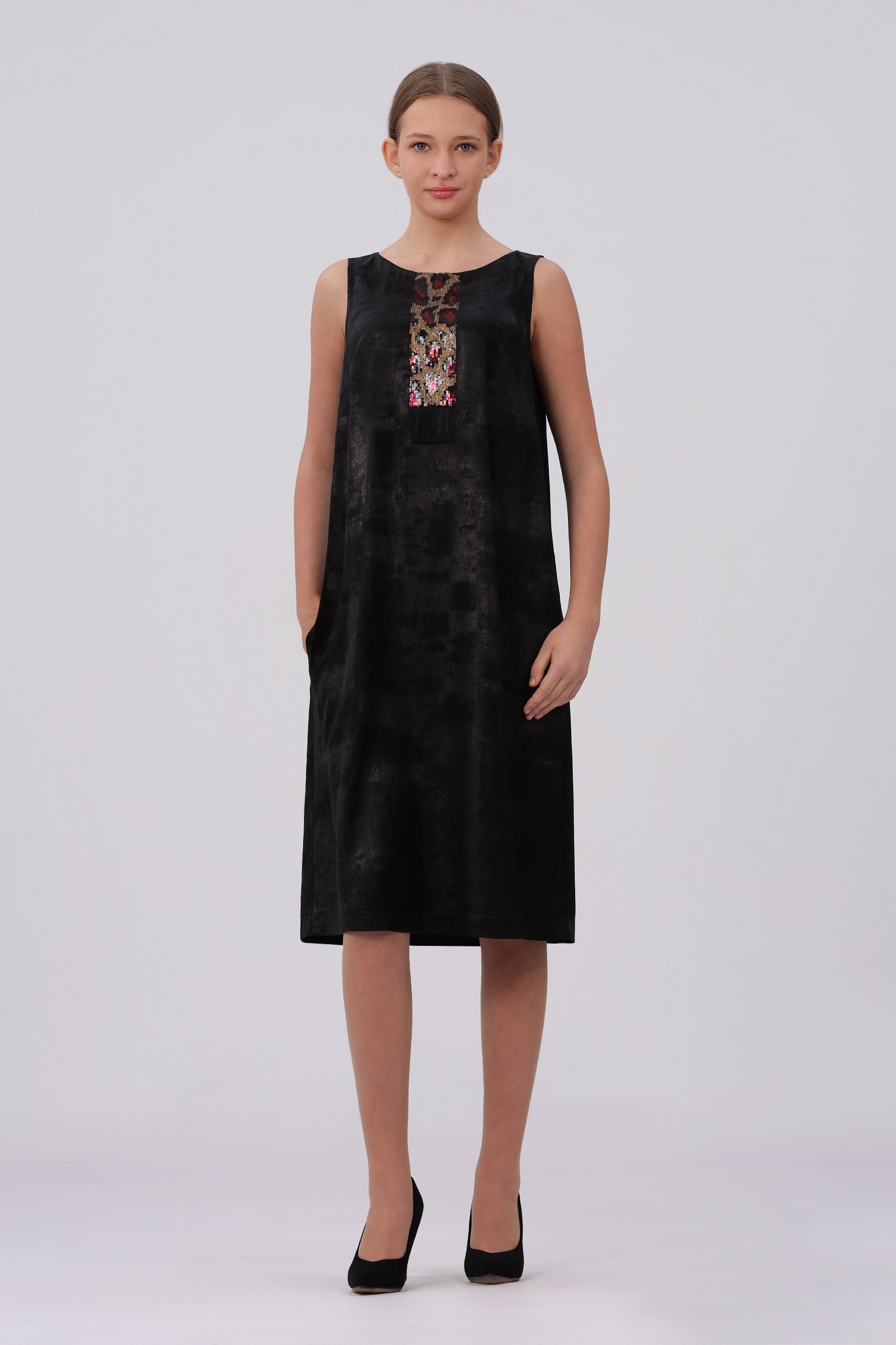 Изящное женское платье свободного кроя станет отличным выбором для торжеств и вечерних мероприятий. Оно выполнено в классическом черном цвете, что делает его универсальным элементом гардероба. Дизайн акцентирует внимание на минимализме и элегантности. Материал изделия отличается мягкой текстурой, что обеспечивает комфорт при ношении. Платье украшено оригинальной пайеточной аппликацией, добавляющей блеска и изысканности. Пайетки привлекают взгляд и создают эффектный стиль, позволяя чувствовать себя уверенно на любом мероприятии. Конструкция платья продумана до мелочей: оно легко сидит по фигуре, подчеркивая достоинства женской фигуры. Свободный крой обеспечивает свободу движений, что особенно важно на вечеринках или праздниках. Этот элемент дизайна делает изделие идеальным для женщин разных возрастов и комплекций. Благодаря своему универсальному дизайну его можно комбинировать с различными аксессуарами: туфлями на каблуках или балетками, ожерельями или браслетами. Оно дополнит любой гардероб стильной ноткой и позволит создавать различные образы в зависимости от выбранных аксессуаров. Производство осуществляется в Беларуси. Размеры 44,46,48 - длина платья по среднему шву на спинке 101 см. Размеры 48,50,52,54 - длина платья по среднему шву на спинке 104 см. В размере 56 длина платья по среднему шву - 105 см.