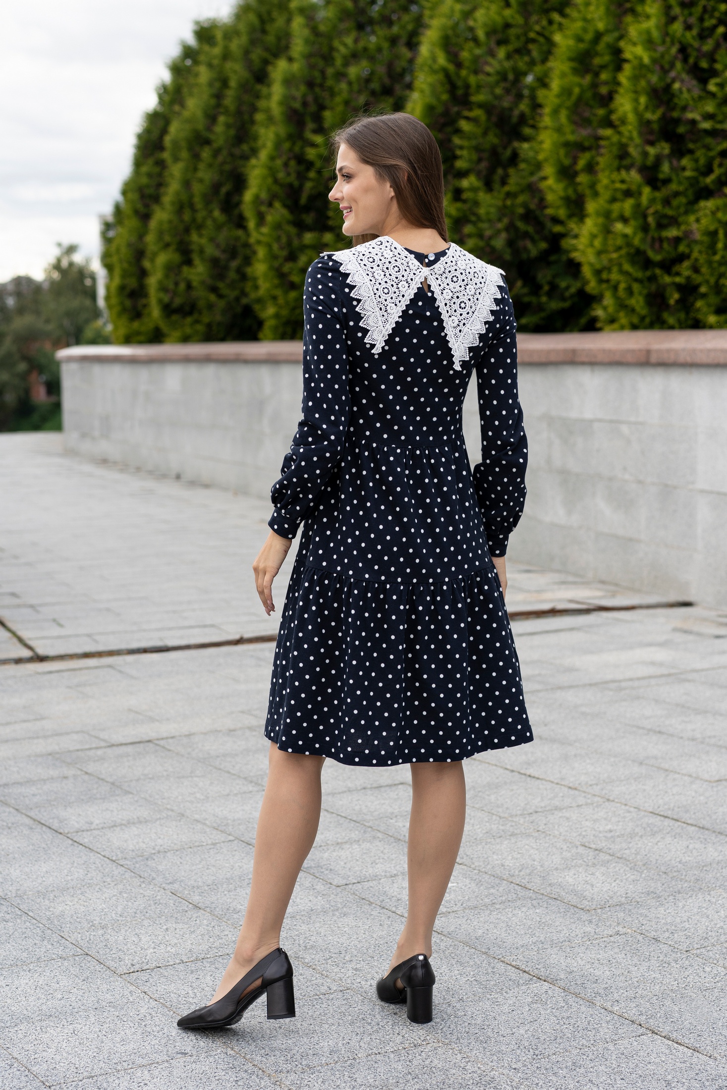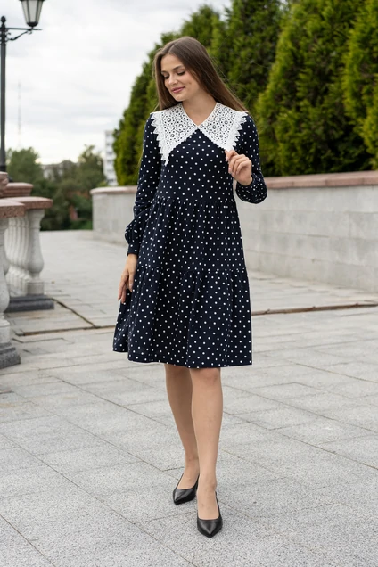 Женское каскадное платье идеально садится по фигуре благодаря полуприлегающему силуэту и нагрудным вытачкам. Платье в горох очаровательно и стильно. Оно подойдет для различных случаев: повседневной носки, офисных мероприятий или даже нарядного выхода. Платье из натуральной ткани с длинным рукавом в стиле бохо имеет двухъярусную сборку, создавая легкость и воздушность образа. Кружевной воротник добавляет изысканности исполнению – не входит в комплект. Длинный втачной рукав со сборкой на манжете придает утонченности и изыска, делая его универсальным элементом гардероба. Нижняя часть этого трикотажного платья состоит из двух частей со сборкой по швам, что создает объем и динамику при движении. Пуговица-капелька с навесной петелькой является изысканным штрихом, завершающим образ. Это платье офисное деловое прекрасно подойдет для рабочего дня, официальных мероприятий. Универсальная базовая вещь, смело отправляйтесь на прогулку по городу осенью, на романтическое свидание весной. Идеальное сочетание комфорта и элегантности делает это женское платье миди must-have этого сезона. Позвольте себе выделиться из толпы, выбрав это прекрасное темное платье в горошек – символ стиля и хорошего вкуса. Длина платья по среднему шву по спинке - 100 см, длина рукава - 64 см.