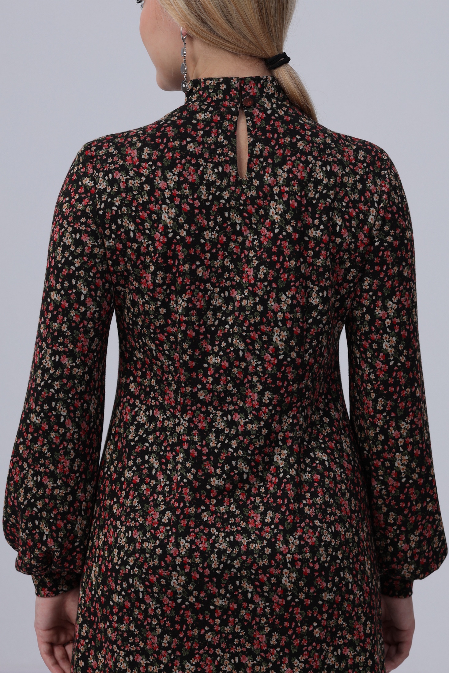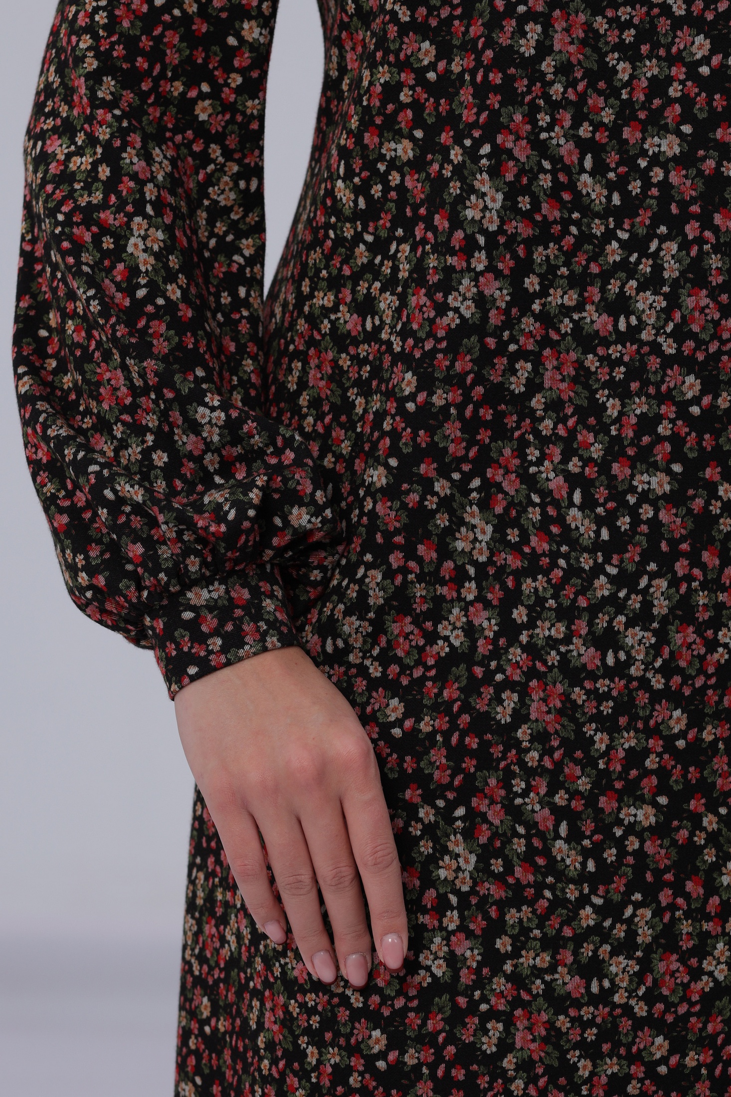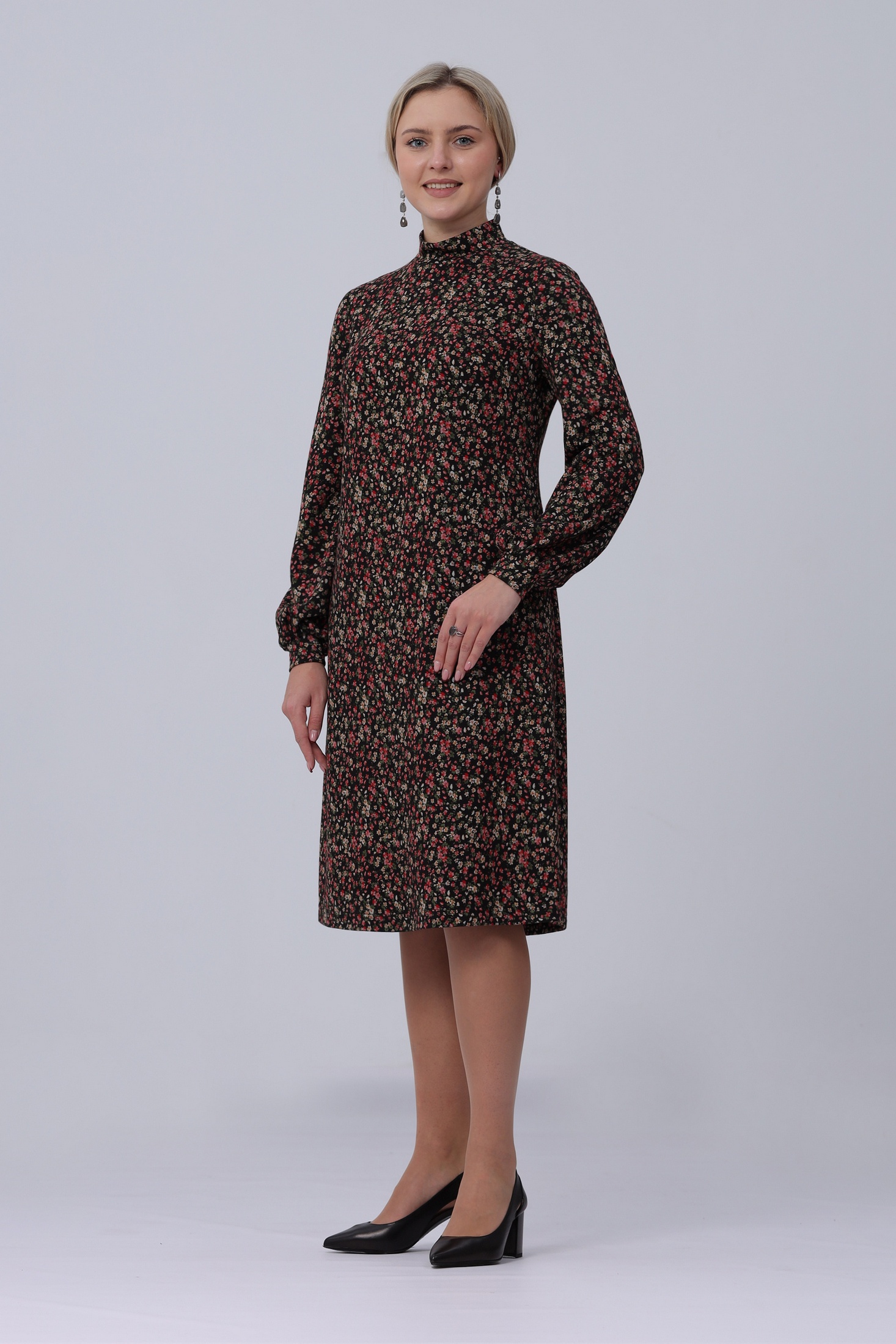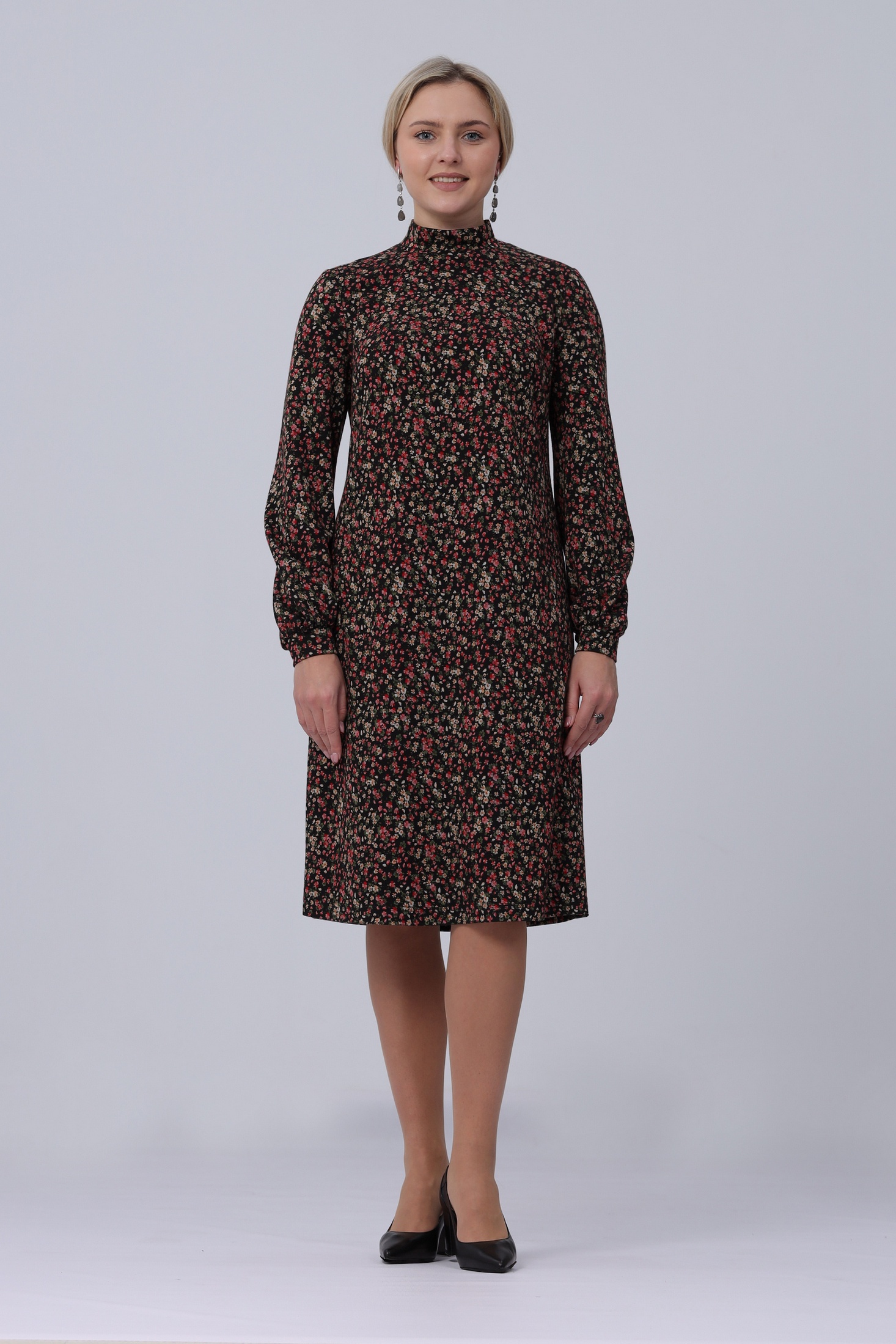 Платье женское полуприлегающего силуэта. Перед с нагрудными вытачками из проймы. Приталенность обаспечивают талиевые вытачки по спинке и боковые швы. Небольшой воротник - стойка. Втачной длинный рукав расширенный книзу, на манжете. На воротнике сзади застёжка - пуговица пристёгивается навесной петелькой. Без карманов. Размеры 44-48: Длина рукава с учётом манжета - 60 см. Длина по спинке - 103 см. Размеры 50-52: Длина рукава с учётом манжета - 61,50 см. Длина по спинке - 104 см. Размеры : Длина рукава с учётом манжета - 62,50 см. Длина по спинке - 107 см.