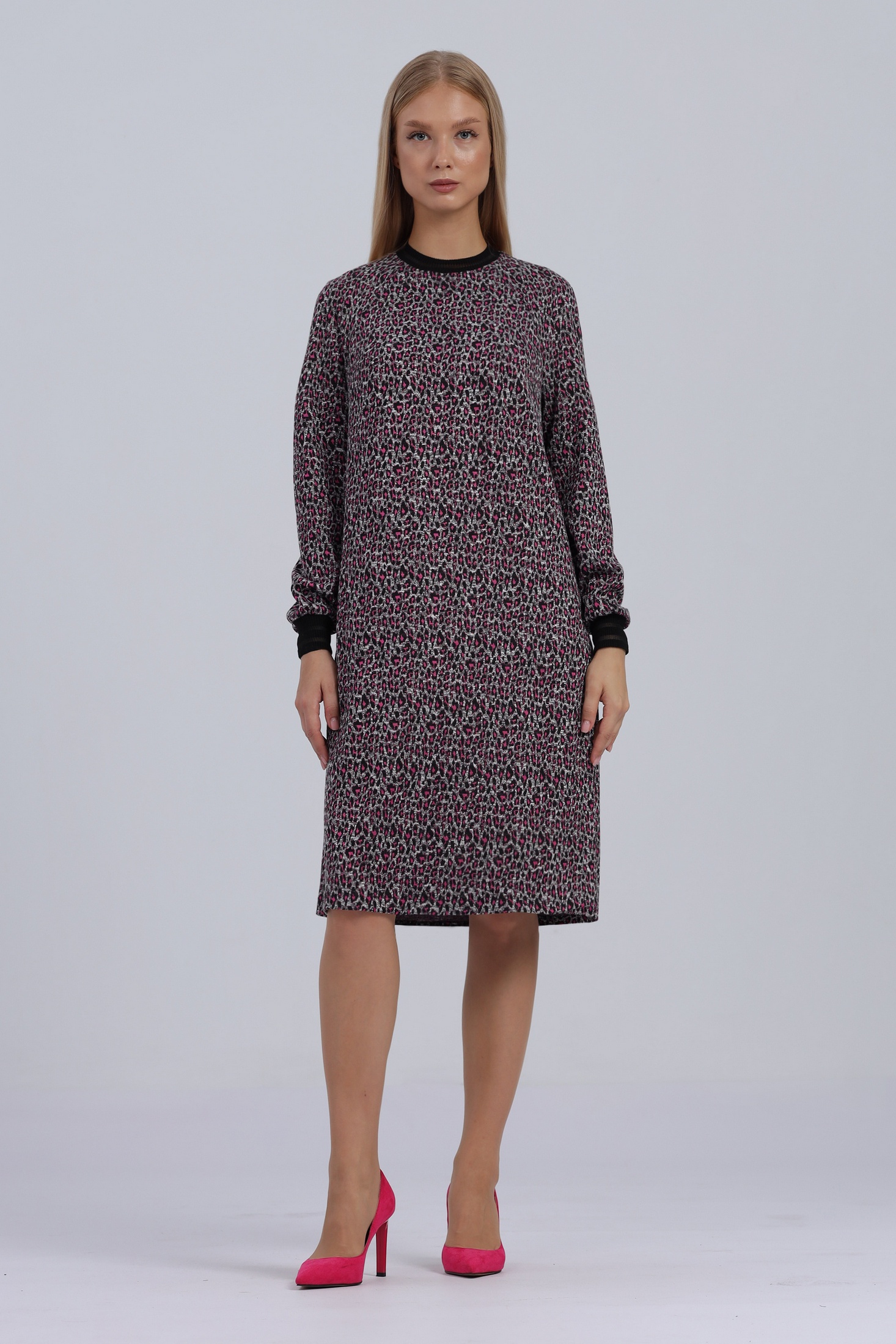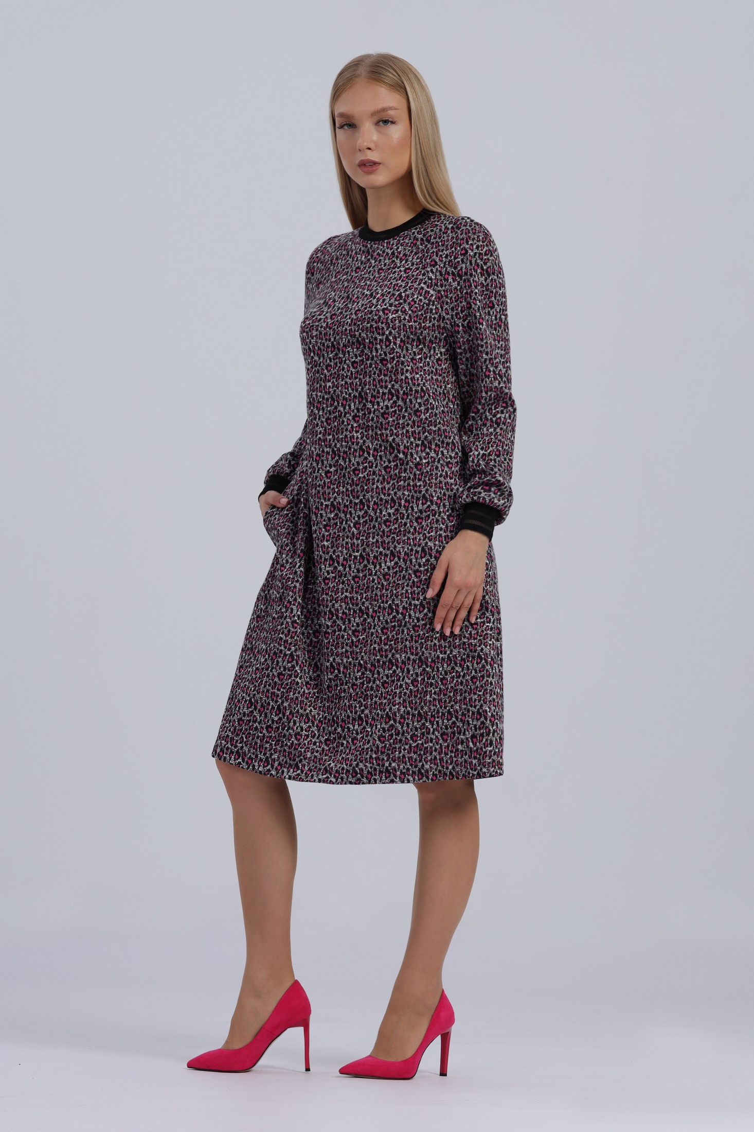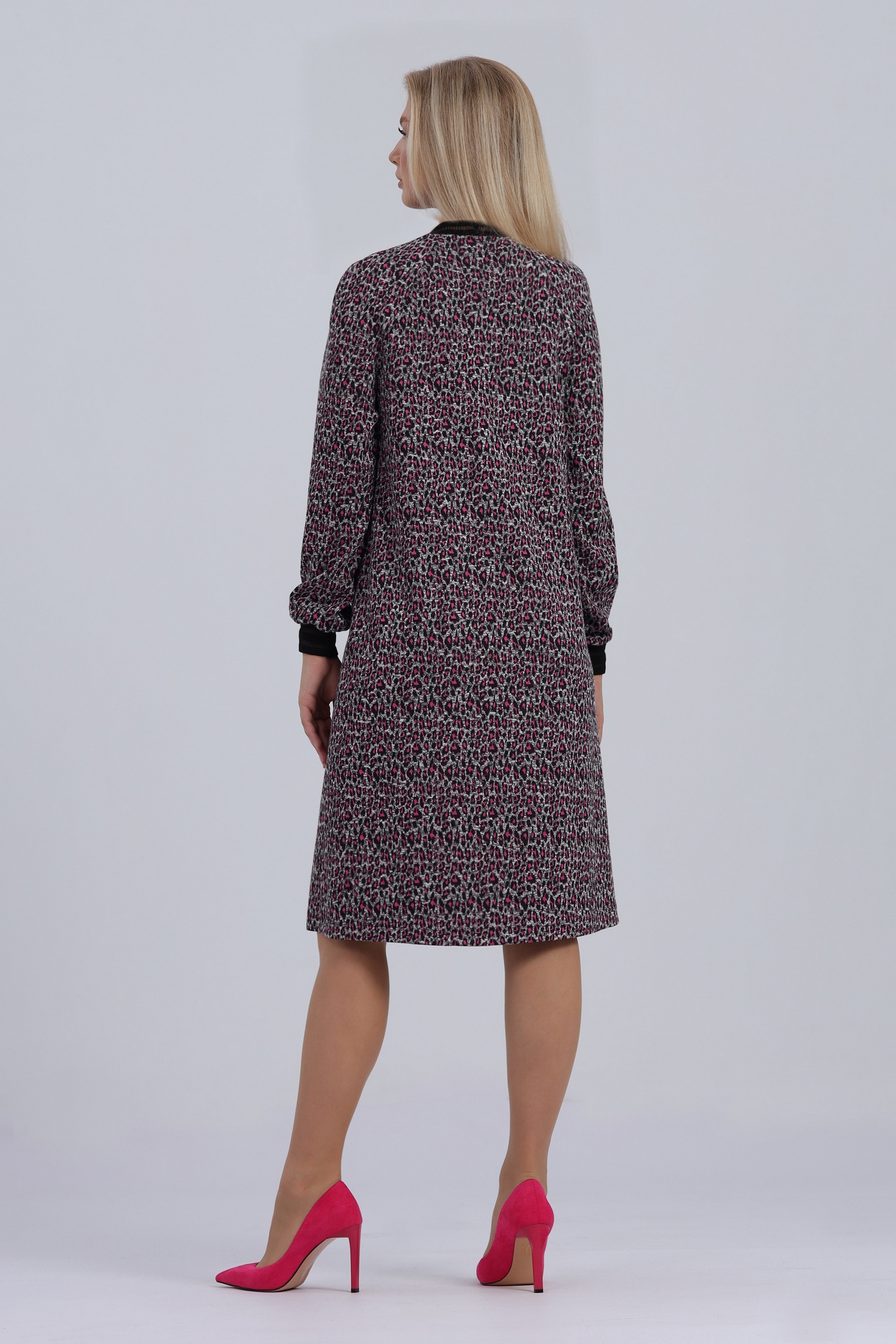 Платье женское А-силуэта свободного кроя. Горловина и рукава дополнены трикотажными довязами. Длинный рукав-реглан с манжетой. Карманы в боковых швах. Без застежки. Размеры 44-50: длина рукава от воротника с учётом манжета - 73 см. Длина по спинке - 99 см. РАзмеры 52-54: длина рукава от воротника с учётом манжета - 75 см. Длина по спинке - 103 см. Рзамеры 56-58: длина рукава от воротника с учётом манжета - 76 см. Длина по спинке - 106 см.