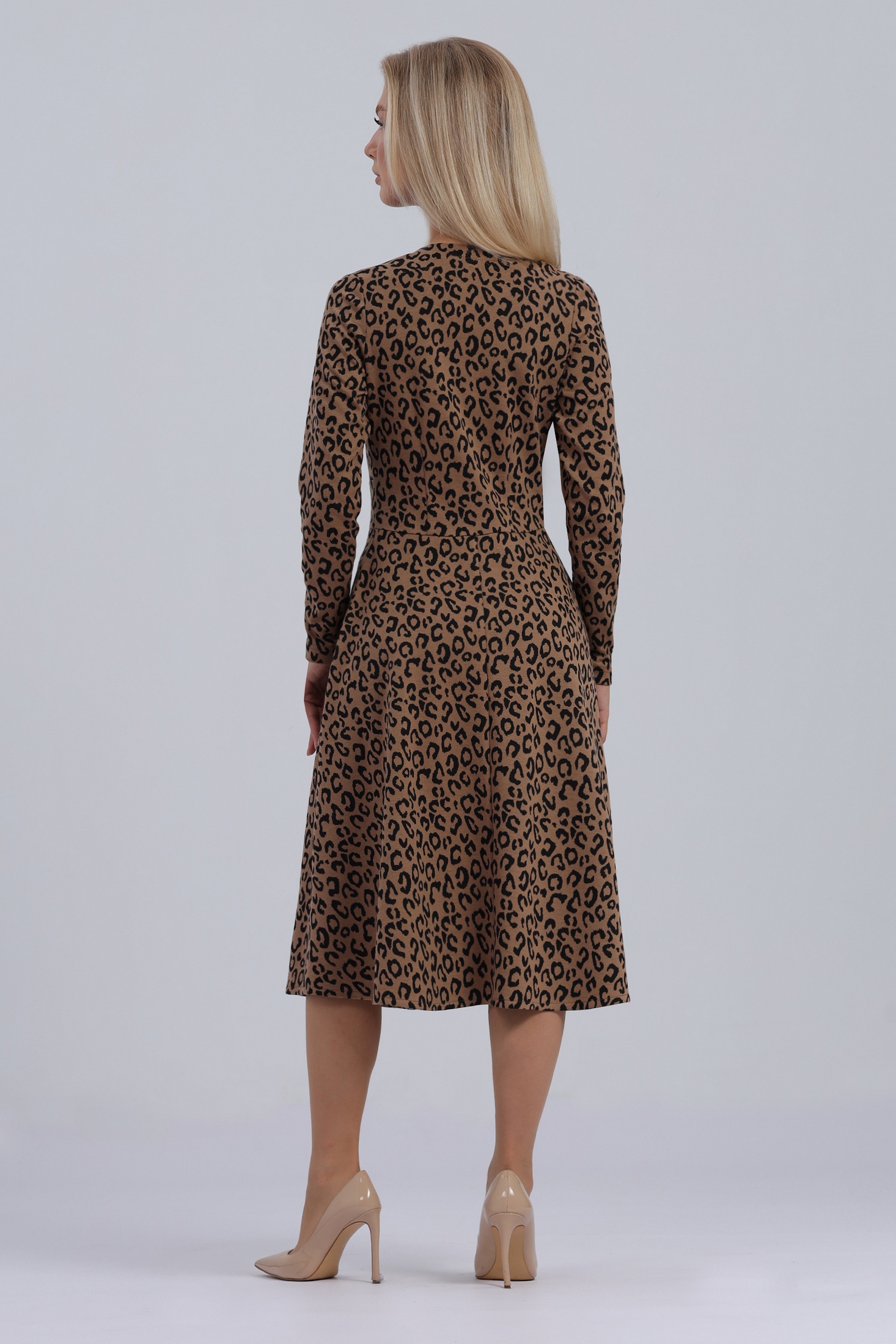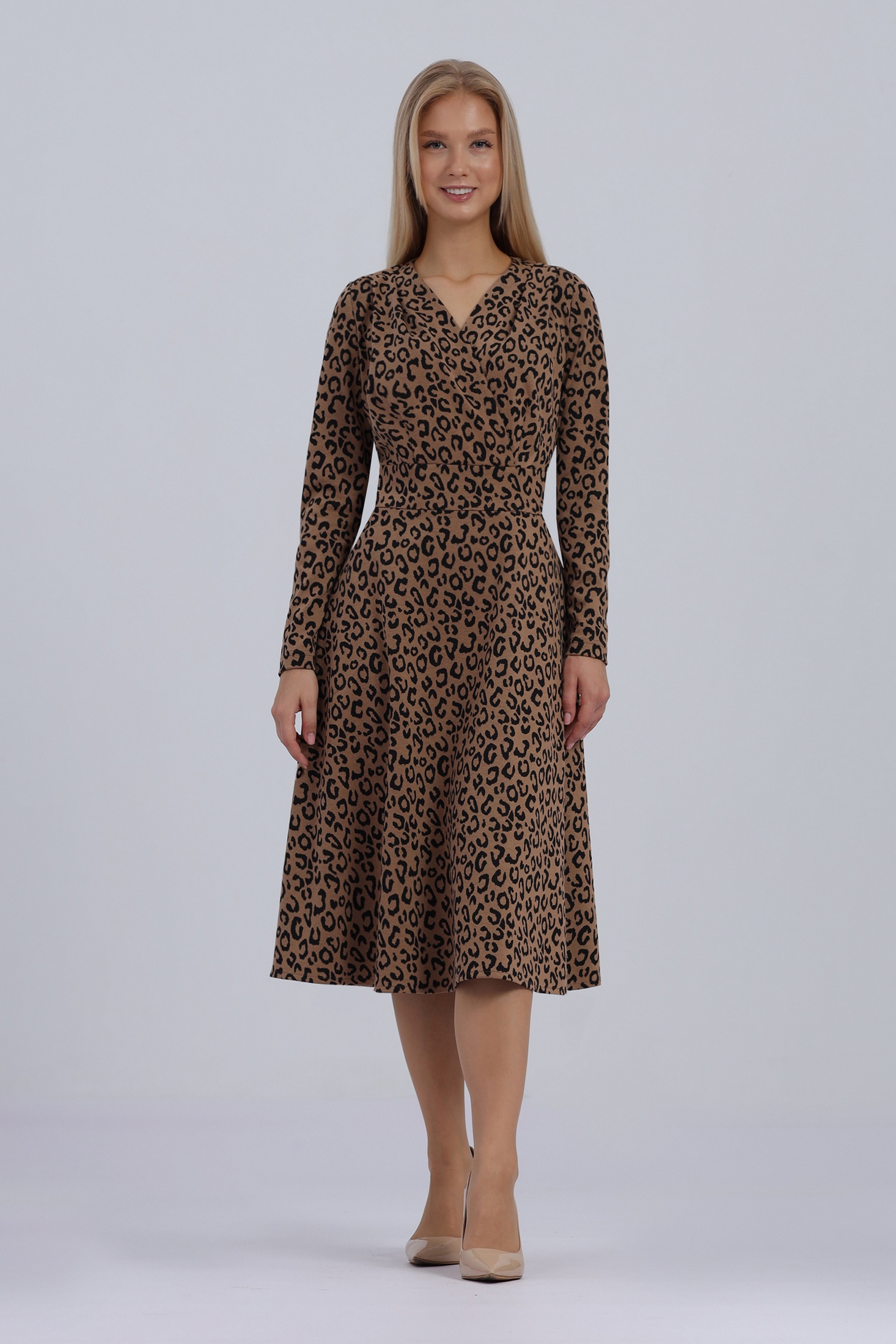 Платье женское приталенного силуэта. Расклешённое от талии. Отрезной лиф на запах со втачным поясом. Две талиевые вытачки спереди и на спинке. Глубокая бантовая складке из плечевого шва. Длинный втачной рукав. По спинке от линии талии выполнен средний шов. Карманы в боковых швах. Нет застёжек.Размеры 44-48: Длина рукава - 60 см. Длина по спинке - 109 см.Размеры 50-54: Длина рукава - 61 см. Длина по спинке - 111 см.