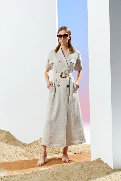 Стильное платье А -силуэта выполнено из 100% льна, V-образный вырез горловины, застежка двубортная на декоративных пуговицах, по бокам прорезные карманы. В комплекте идет сьемный пояс.
