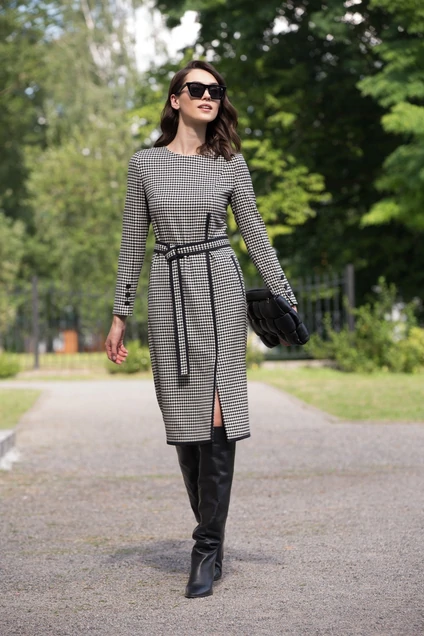 Стильное приталенное платье длиной чуть ниже колена. Изящность придает разрез в рельефе с контрастным кантом . Застежка по спинке потайная молния.