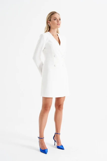 Платье полуприлегающего силуэта . Оно выполнено в виде удлиненного пиджака с двубортным застежкой , по всей длине застегивается на пуговицы. Платье на запах с V-образным вырезом. Рукав втачной, длинный , двухшовный. Платье на подкладке, кроме рукава.