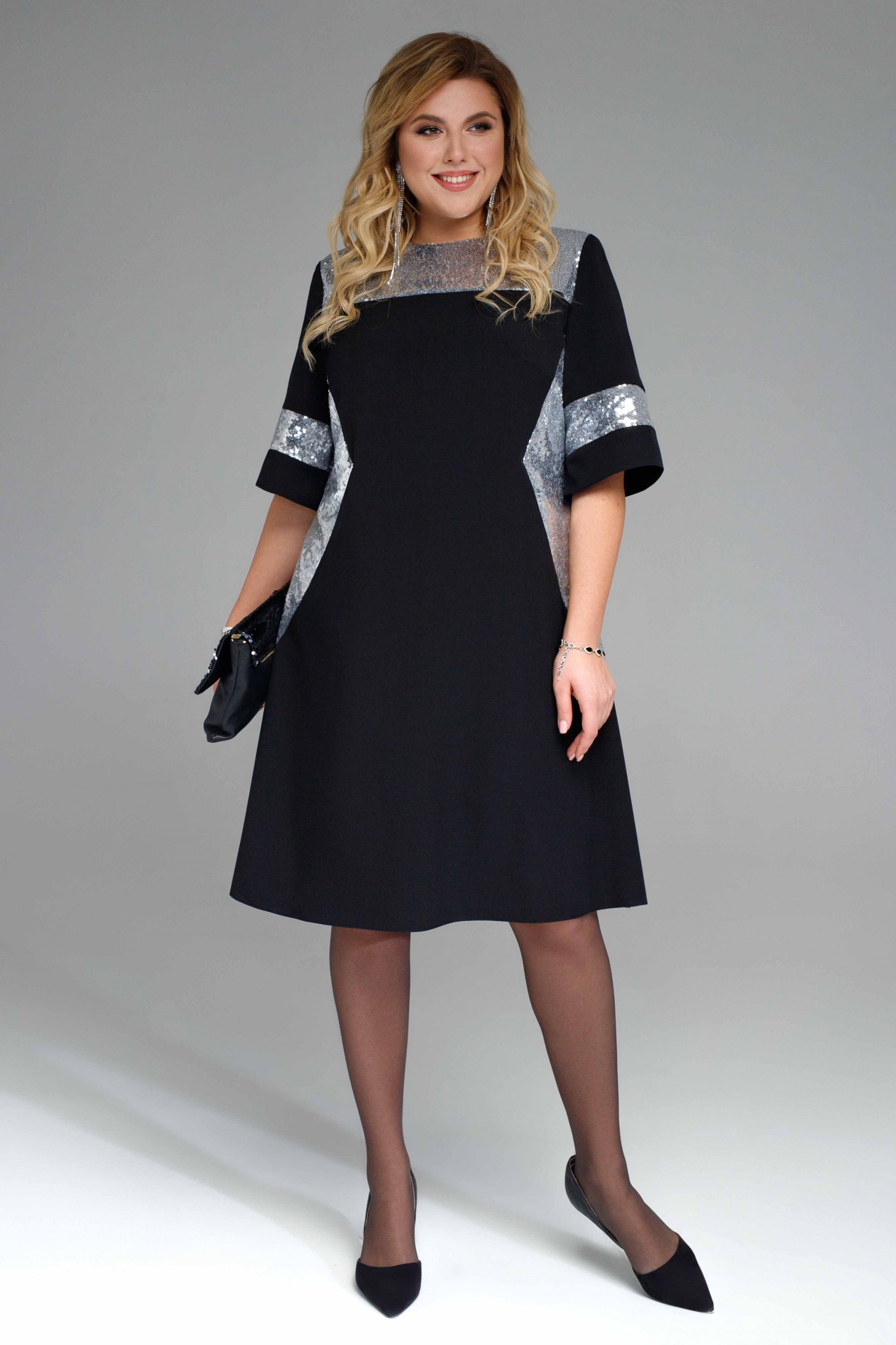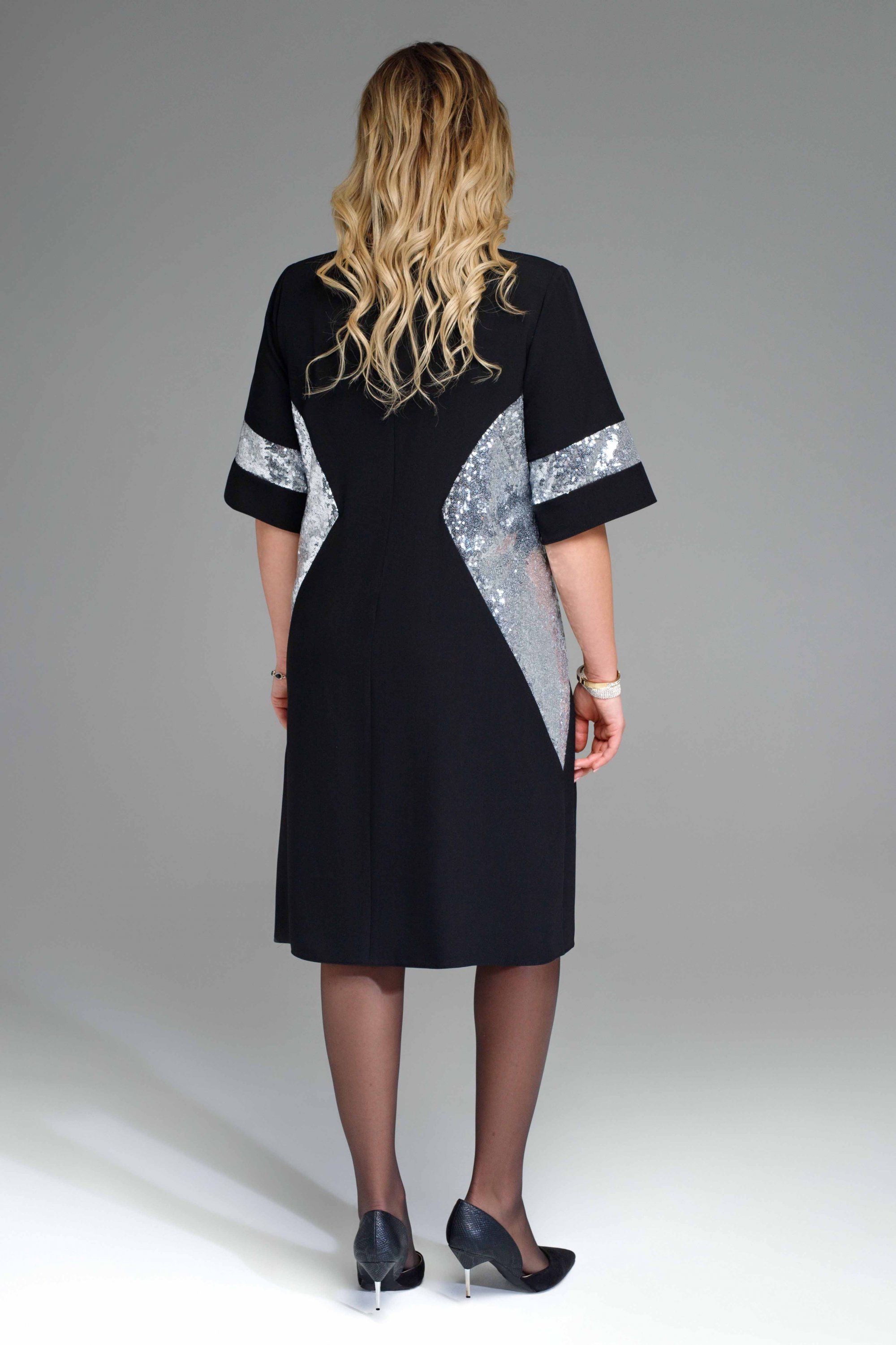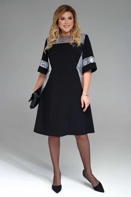 Женское платье расширенного к низу силуэта, а в области талии полуприлегающего силуэта. Платье выполнено из ткани костюмно-плательного ассортимента. Отделочной тканью служит ткань с пайетками. По переду и спинке есть фигурные рельефы, угол которого располагается на линии талии. Бочки переда и спинке выполнены из отделочной ткани. Вырез горловины округлый. По переду есть отрезная кокетка, которая также выполнена из отделочной ткани. Рукав втачной, прямого силуэта. По низу рукава есть отрезная неширокая вставка, выполненная из отделочной ткани. Спинка со средним швом, в котором располагается застежка на потайную тесьму-молнию. Длина рукава 35 см. Длина платья по среднему шву от горловины 105 см.