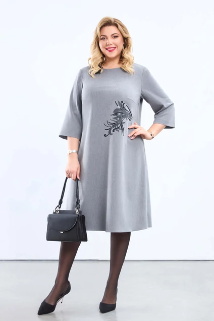 Женское платье слегка расширенного к низу силуэта, выполненное из ткани костюмно-плательного ассортимента. Вырез горловины округлый. Рукава втачные, длиной ¾. По переду платья в области талии с левой стороны располагается крупная вышивка контрастного цвета. Спинка со средним швом, в котором расположена застежка на потайную тесьму-молнию.