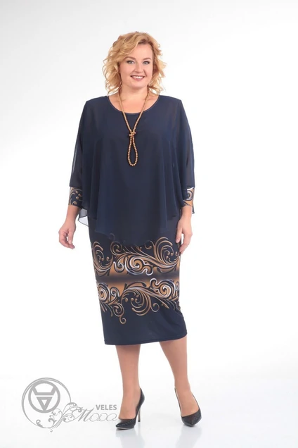 Нижнее платье из трикотажа. В округлой горловине закреплена накидка из шифона с цельновыкроенными рукавами в ¾ длины. Низ рукавов собран на манжеты из ткани нижнего платья. Длина – 110 см.