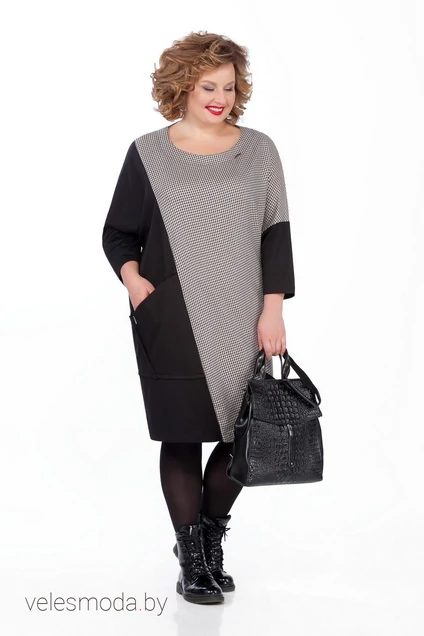Платье-туника скомбинирована из трикотажа и плательно-костюмной ткани. Свободный крой «оверсайз», спущенная линия проймы. Перед и спинка асимметрично разделены косым рельефом от плеча до низа. Спереди обработан накладной карман, а на спинке декоративные подрезы. Длина по спинке 102см, длина рукавов около 46см.