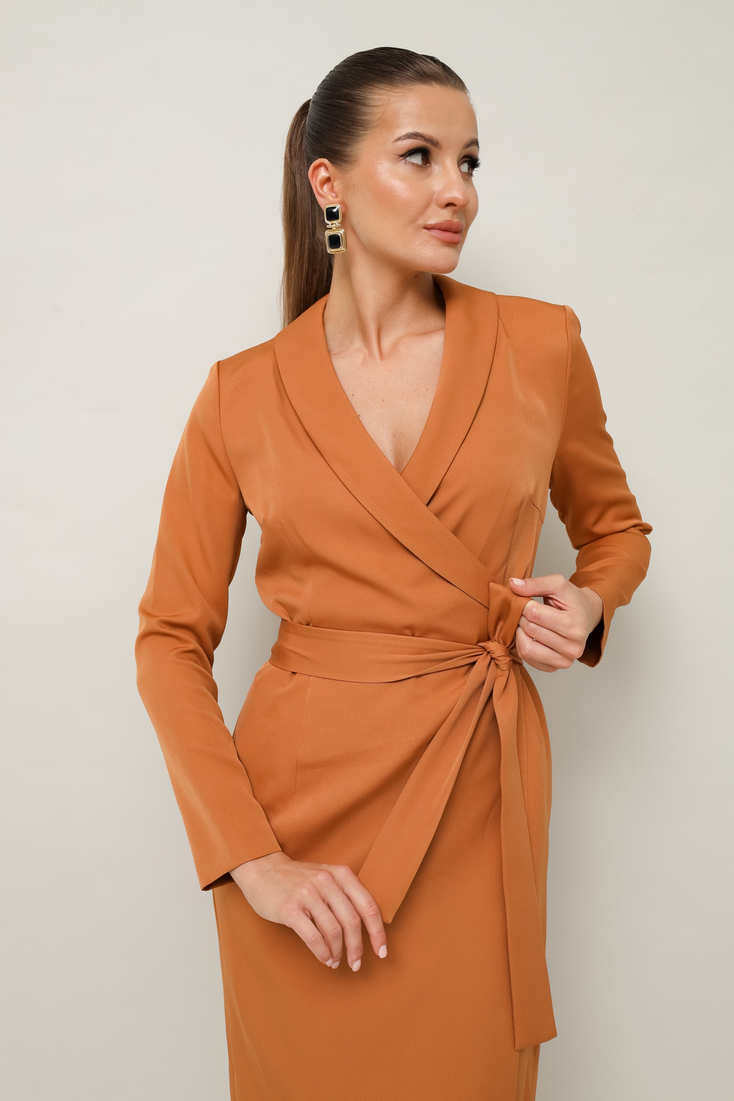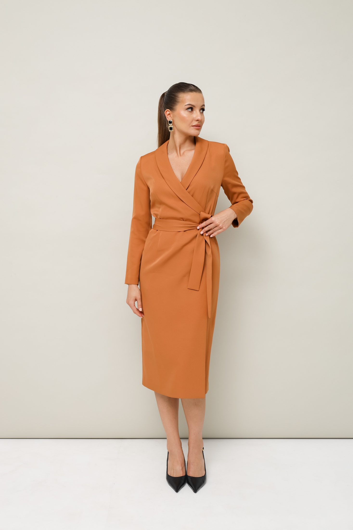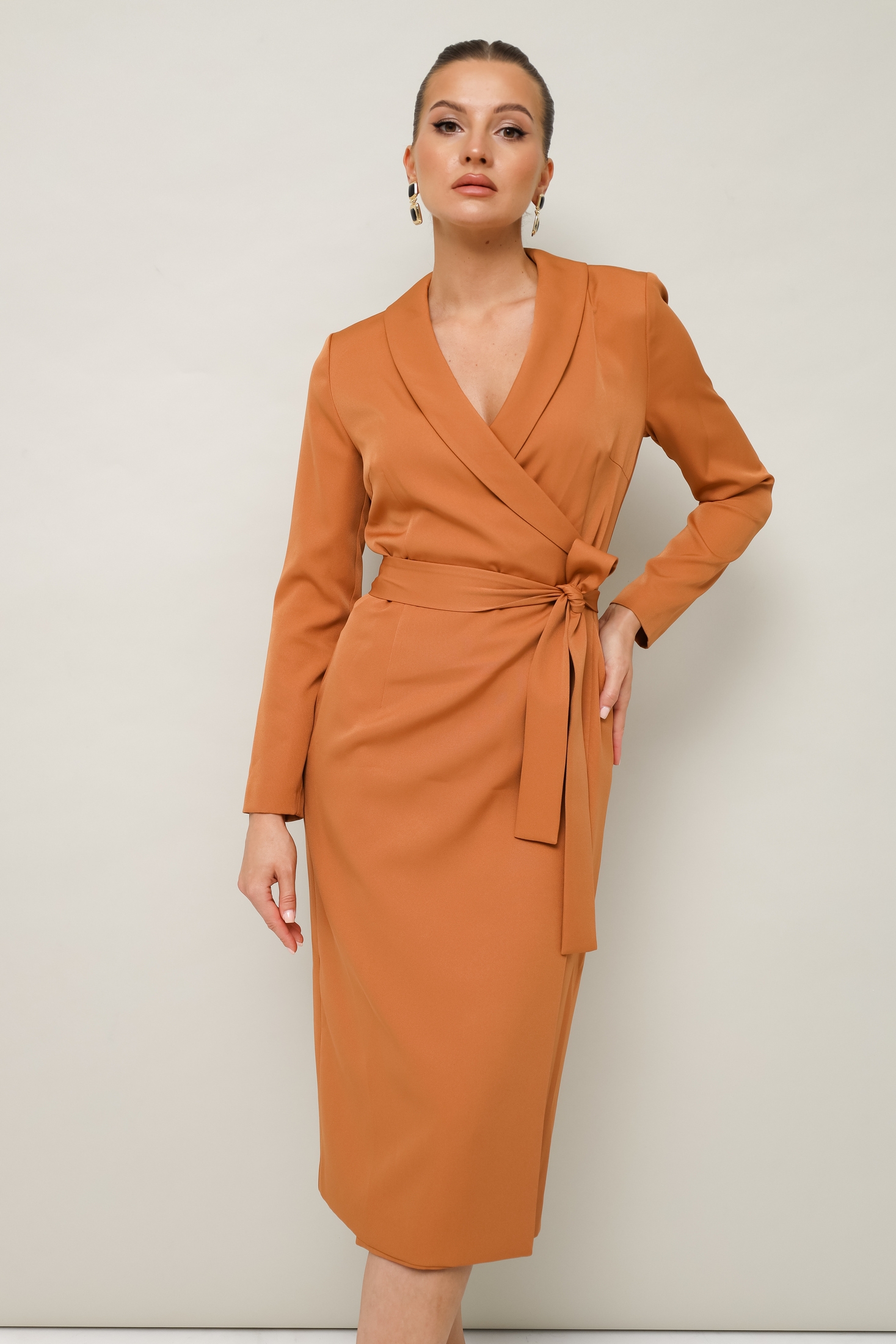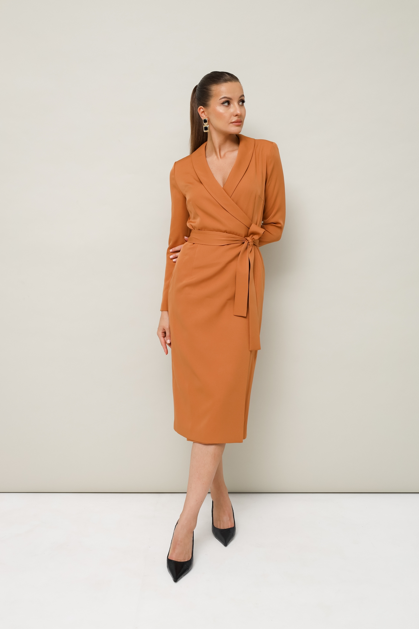 Эгегантное платье- футляр на запах- незаменимый элемент дамского гардероба. Длина миди, имеет V образную линию декольте на груди, а талию можно корректировать поясом. Платье изнутри завязывается на шнурок и потайную кнопку. Пояс съемный. Ткань плательная,средней плотности, достаточно мягкая приятная на ощупь.Длина 113см. Рукав 59 см.