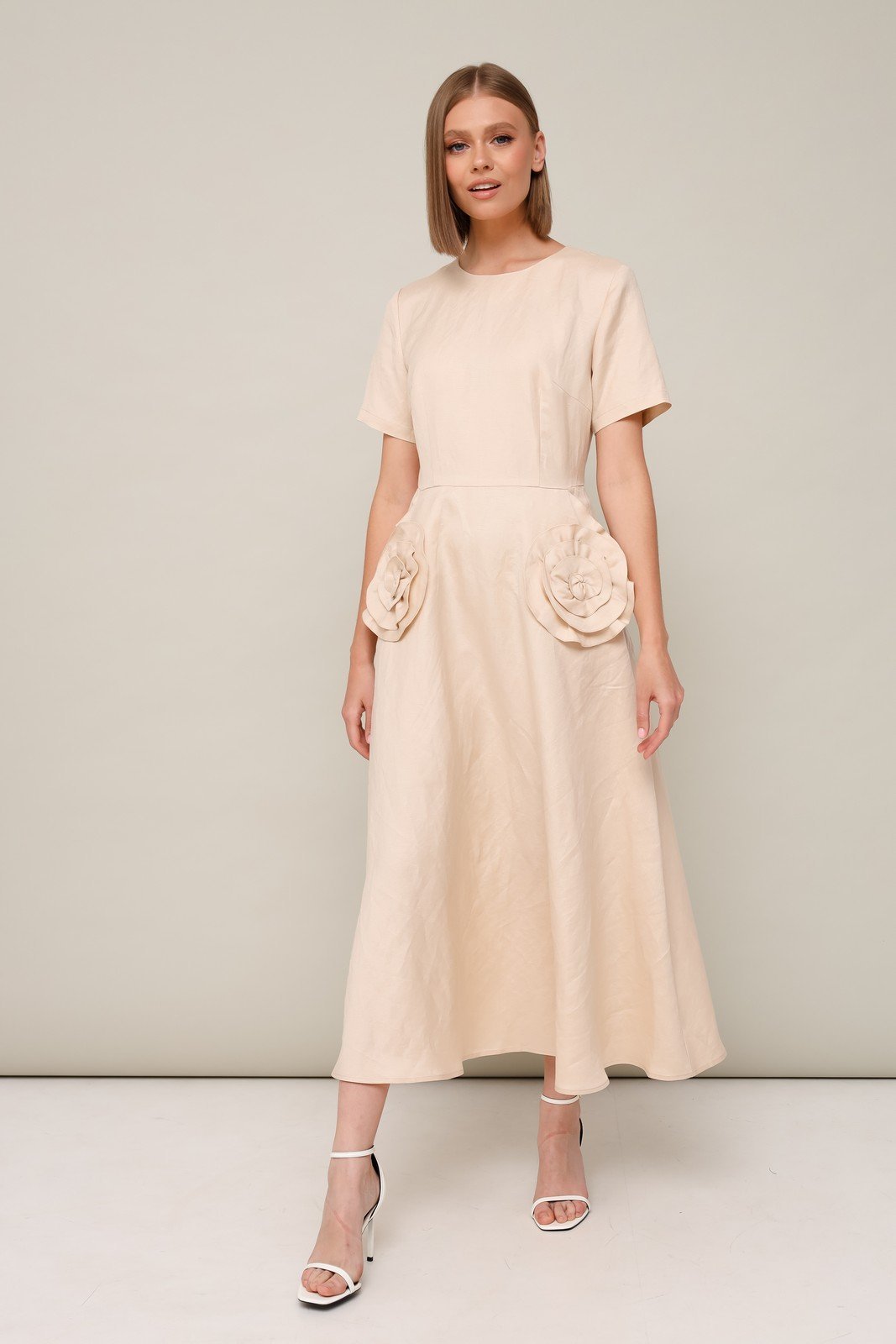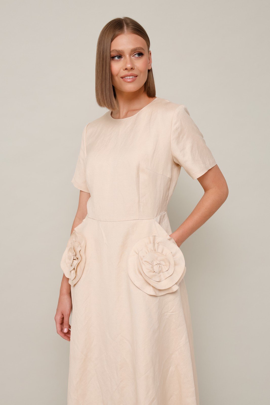 Эффектное платье, отрезное по линии талии с юбкой А-образного силуэта. Горловина округлой формы. Боковые наклонные карманы, декорированные элементами из основной ткани в виде цветка. Застежка по спинке в среднем шве на потайную молнию. Платье без подкладки.