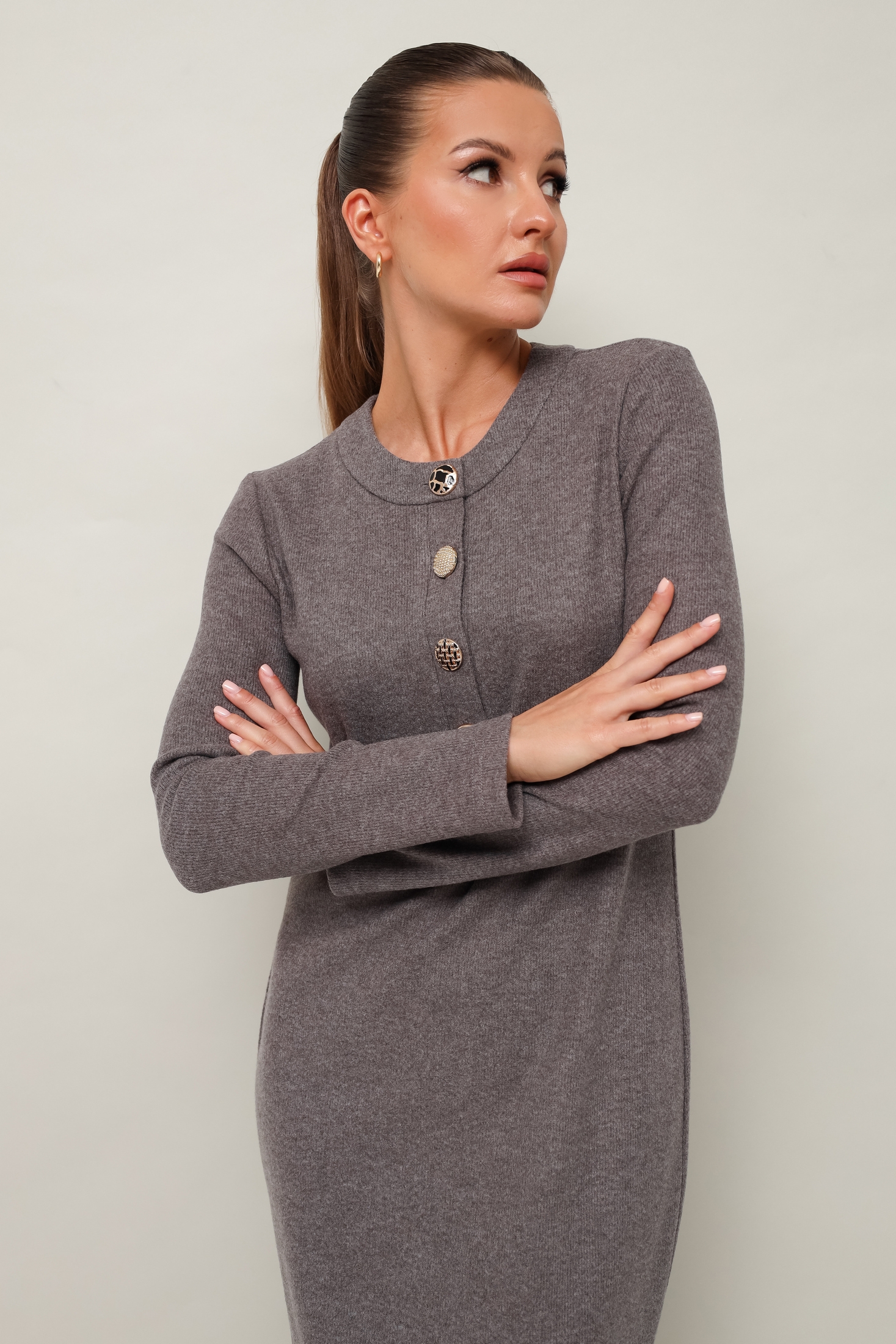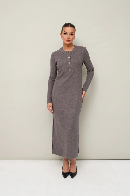 Стильное платье полуприлегающего силуэта, выполнено из трикотажного полотна. Горловина округлой формы, с центральной застежкой на петли и 4 разных пуговицы. Рукава длинные втачные. В боковых швах обработаны высокие разрезы.