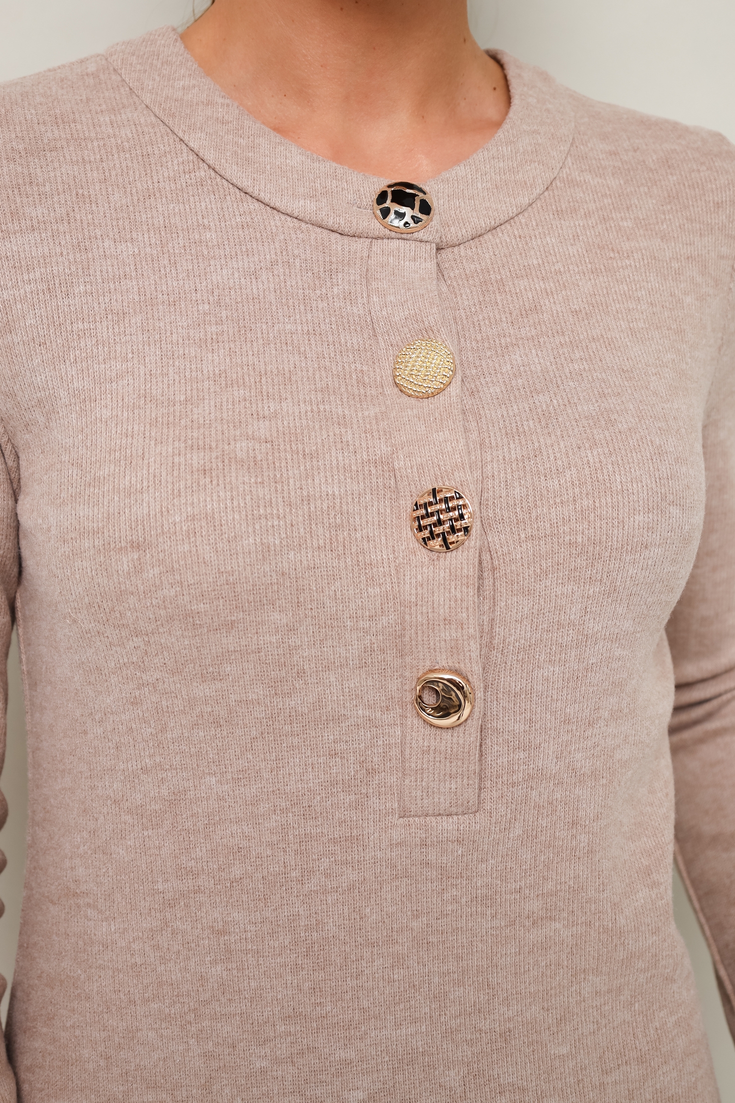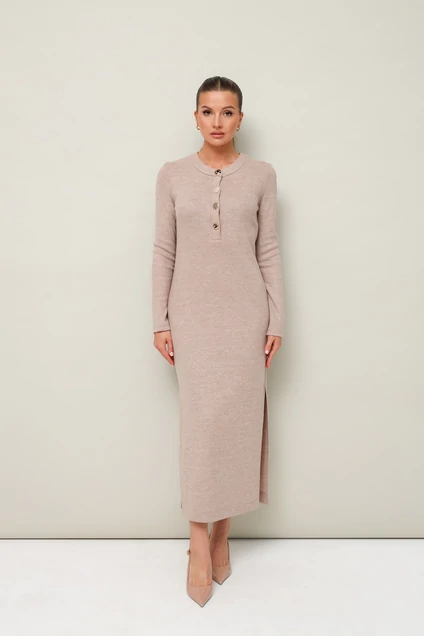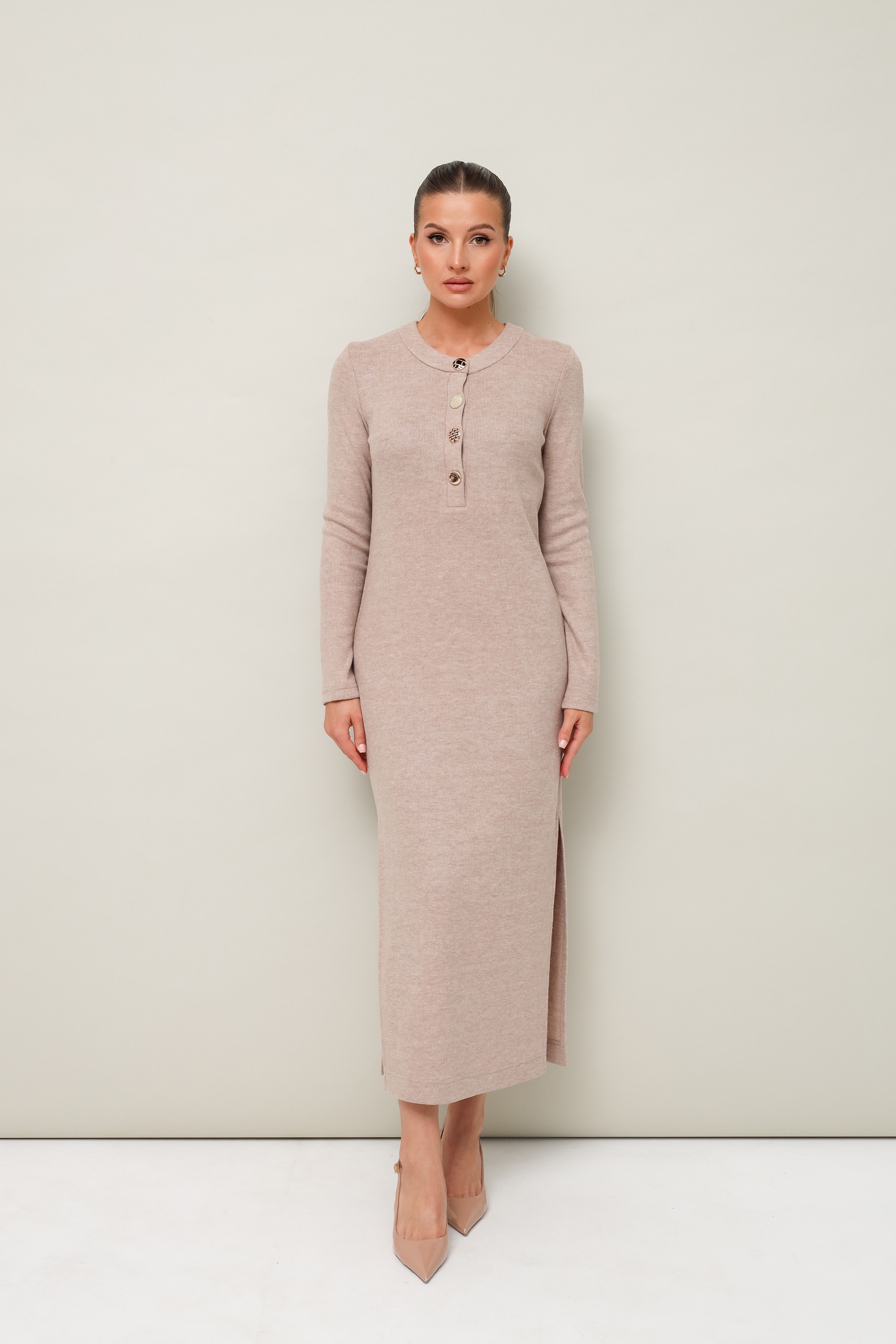 Стильное платье полуприлегающего силуэта, выполнено из трикотажного полотна. Горловина округлой формы, с центральной застежкой на петли и 4 разных пуговицы. Рукава длинные втачные. В боковых швах обработаны высокие