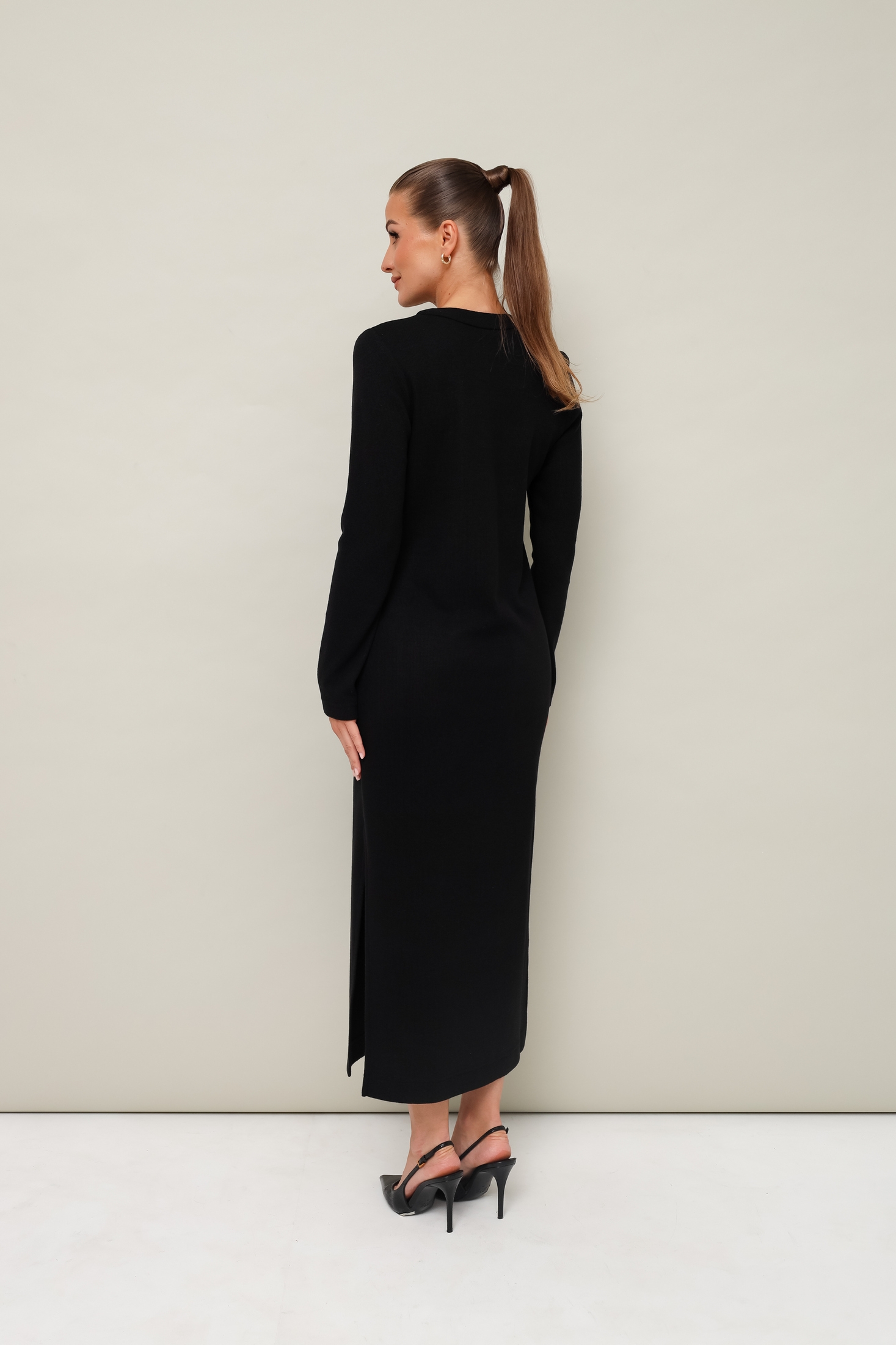 Стильное платье полуприлегающего силуэта, выполнено из трикотажного полотна. Горловина округлой формы, с центральной застежкой на петли и 4 разных пуговицы. Рукава длинные втачные. В боковых швах обработаны высокие