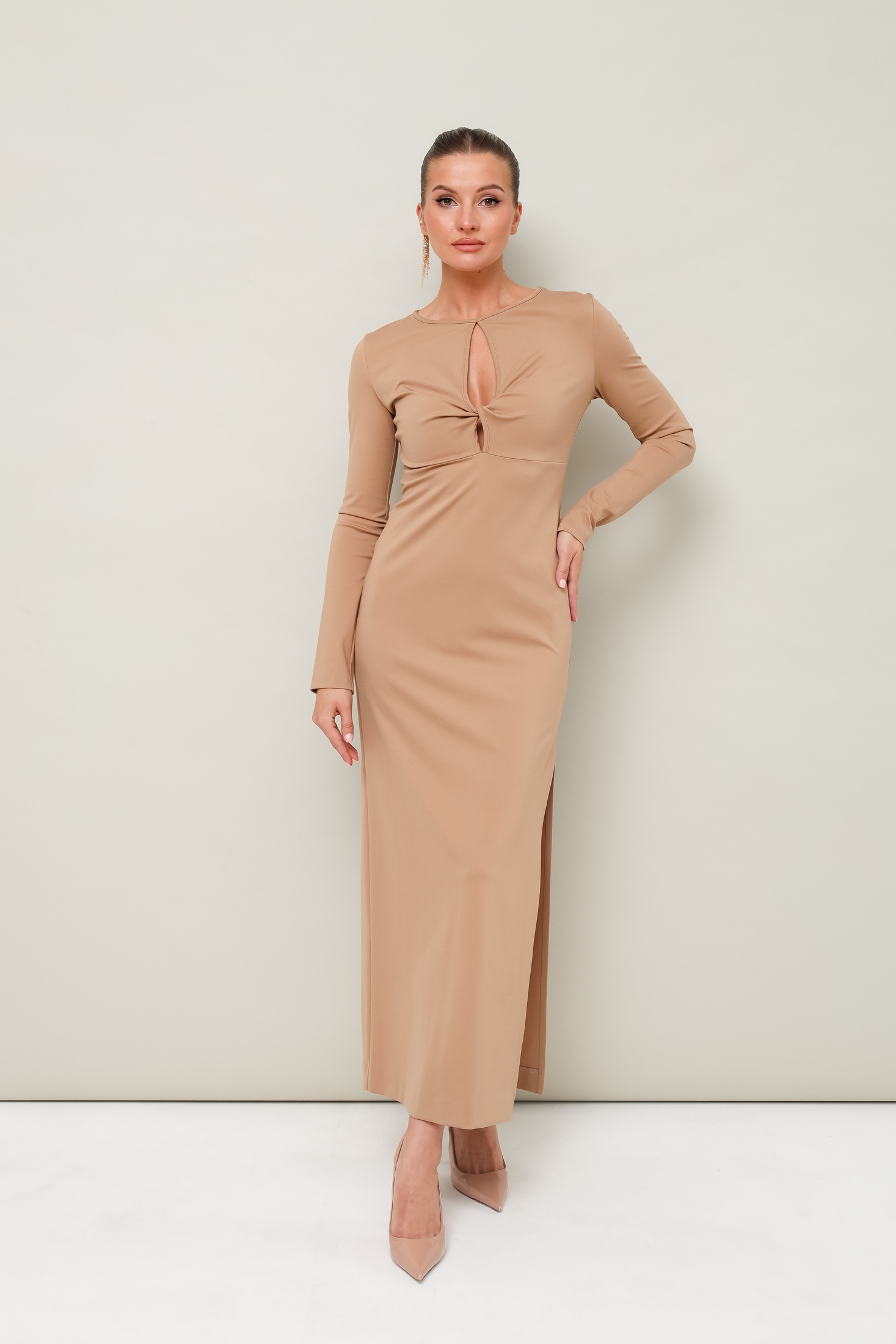Элегантное миди-платье бежевого оттенка издано для создания изысканных образов. Модель выполнена из высококачественного эластичного трикотажа, что обеспечивает отличную посадку и комфорт при носке. Дизайн платья включает округлую горловину с эффектным вырезом "капля", придающим образу легкую игривость. Особое внимание уделено лифу, где присутствует изящный декоративный узел с подрезом, акцентирующий линию груди. Длинные втачные рукава дополняют строгий силуэт, а высокий разрез в боковом шве добавляет платью изысканности и свободы движений. Спинка оформлена средним швом, подчеркивая элегантность модели. Это платье идеально подойдет для торжественных мероприятий, обеспечивая не только стиль, но и удобство.