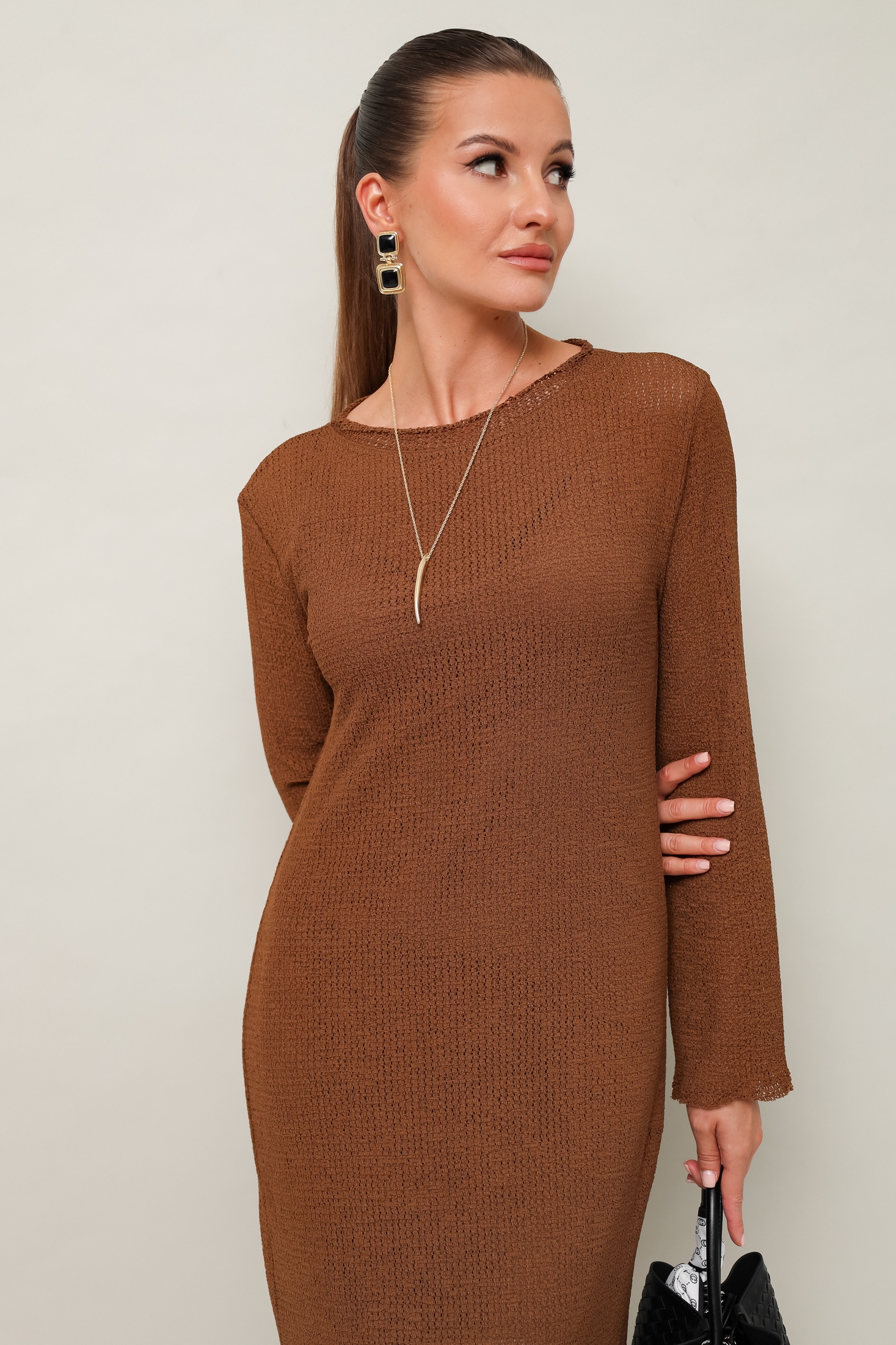 Элегантное длинное платье из мягкого структурного трикотажа в тёплом темно-коричневом оттенке. Изящный вырез "лодочка" гармонично сочетается с длинными рукавами, имеющими слегка расширенные манжеты и спущенную линию шва в области плеч. Полуприлегающий силуэт платья подчеркивает фигуру, сохраняя при этом утонченную расслабленность. В комплект входит удобное нижнее платье-комбинация на тонких бретельках с регулировкой длины, выполненное из эластичного полотна, что обеспечивает дополнительный комфорт и практичность. Это платье станет идеальным выбором для современной женщины, стремящейся выглядеть стильно и элегантно в любой ситуации.