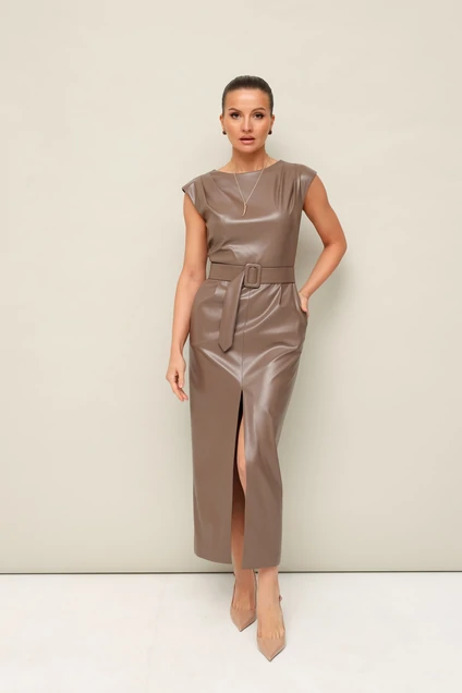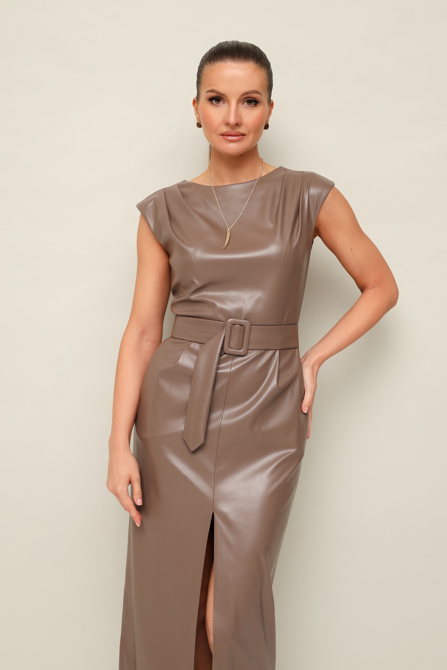 Элегантное платье миди из экокожи цвета топленого молока. Модель с округлым вырезом горловины и V-образным вырезом на спинке. Платье отрезное по линии талии с защипами на плечевых швах лифа и по талии, добавляющими изысканности силуэту. Юбка украшена средним швом, который элегантно переходит в разрез, придавая изысканность образу. Застежка на потайную тесьму-молнию расположена в среднем шве спинки. К платью прилагается пояс из основной ткани с элегантной обтяжной пряжкой, который подчеркивает талию и завершает образ.