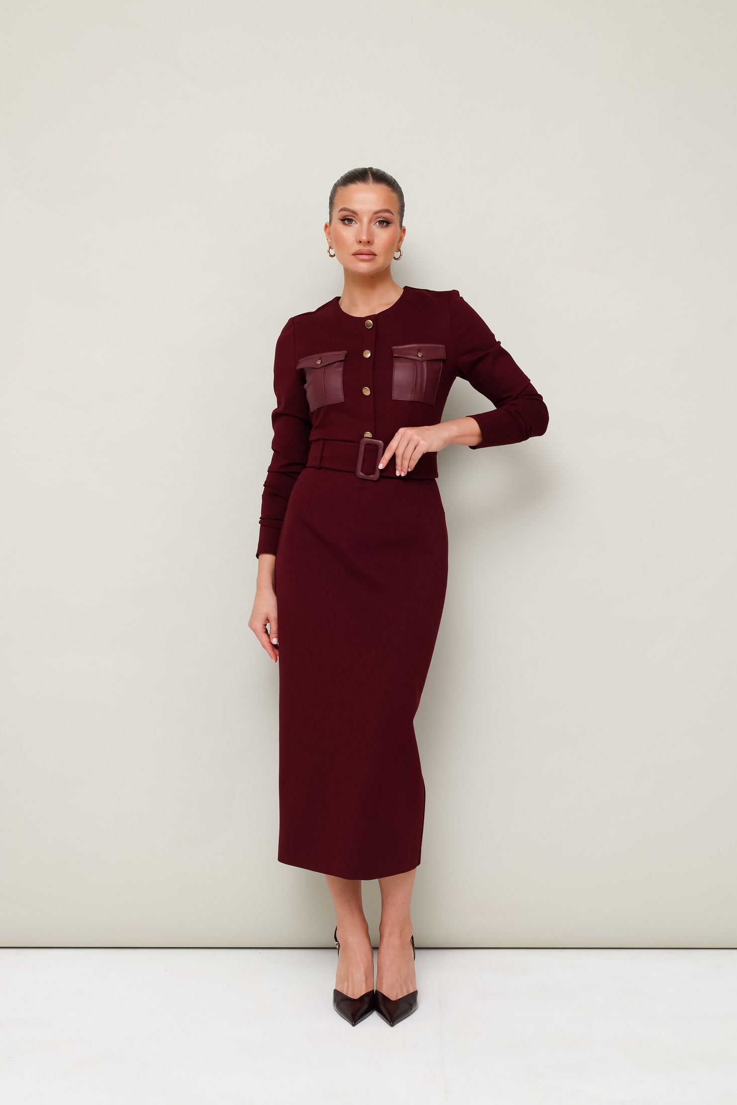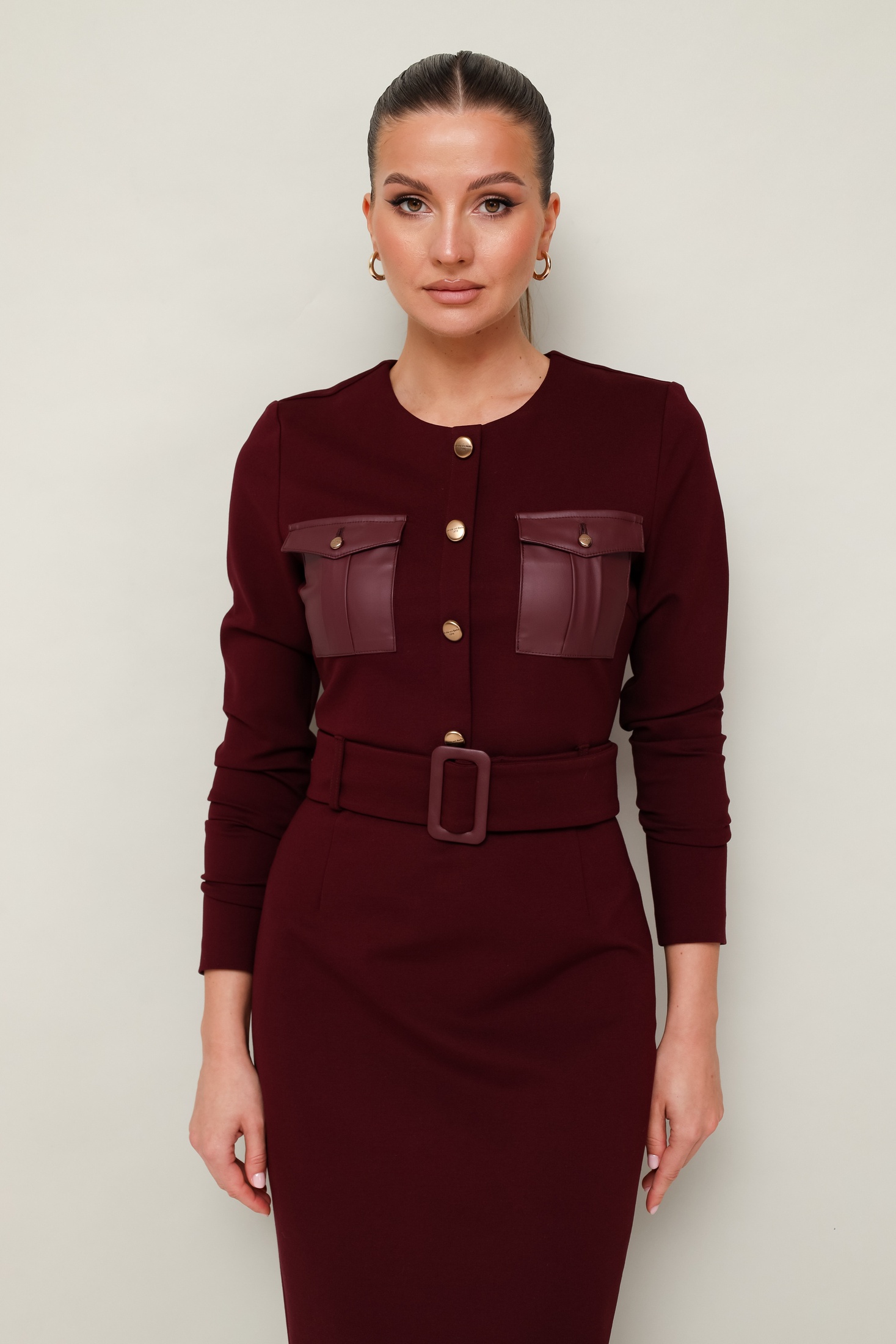 Горловина округлой формы. По лифу обработана планка с пуговицами и нагрудные накладные карманы с клапанами. Длинные втачные рукава. Спинка с застежкой на потайную молнию в среднем шве. Для удобства движения сзади обработан разрез.