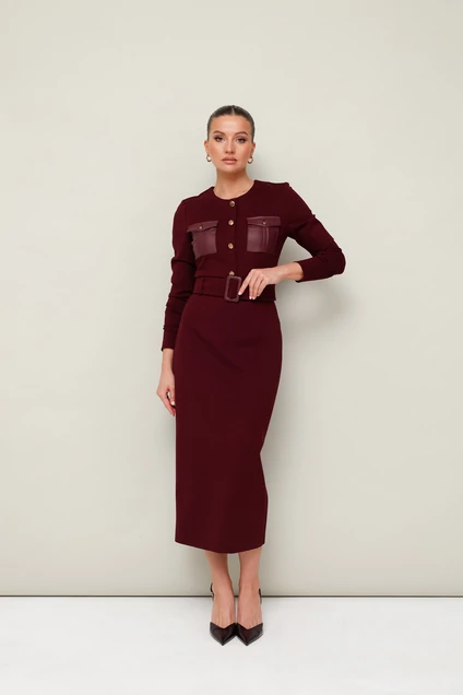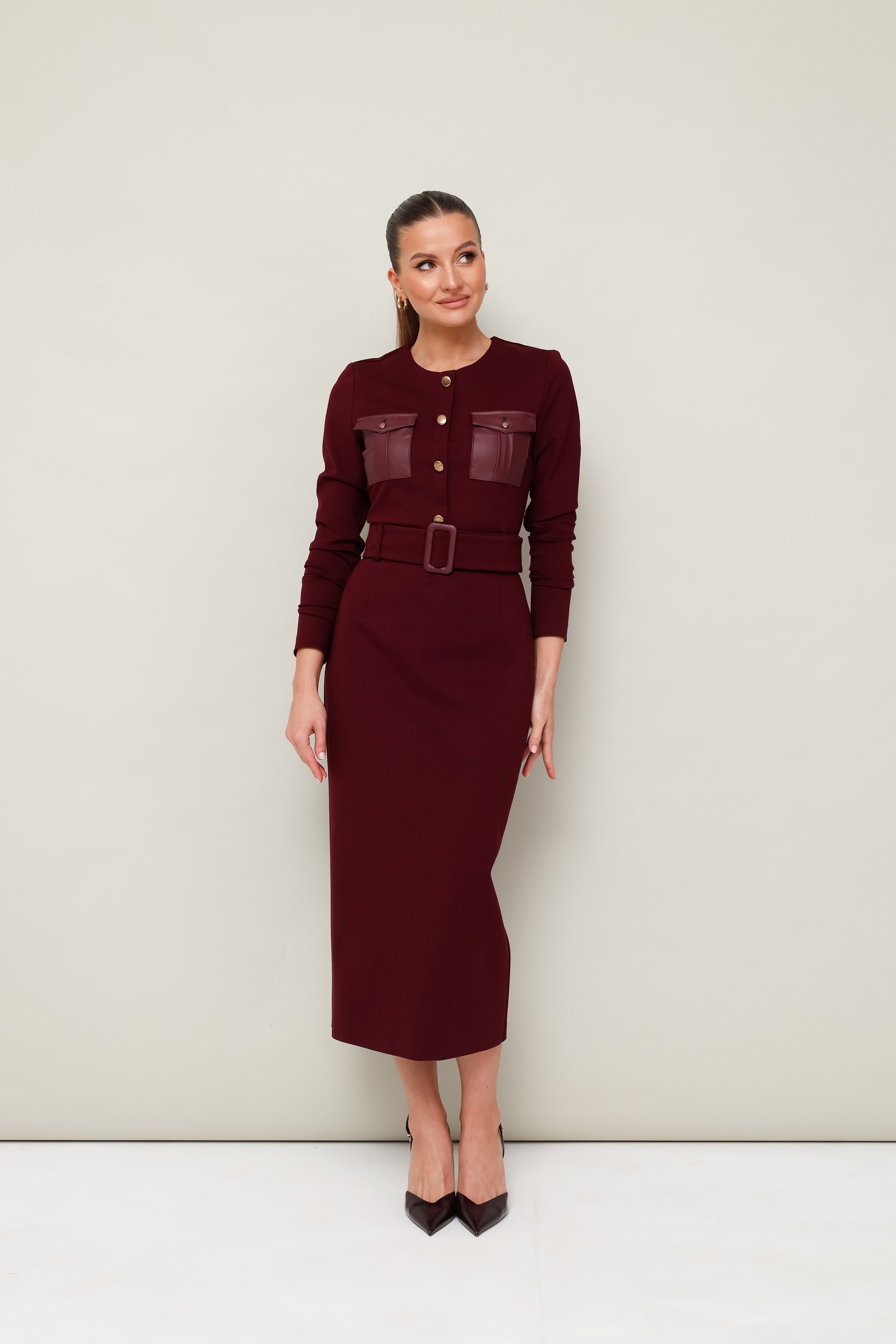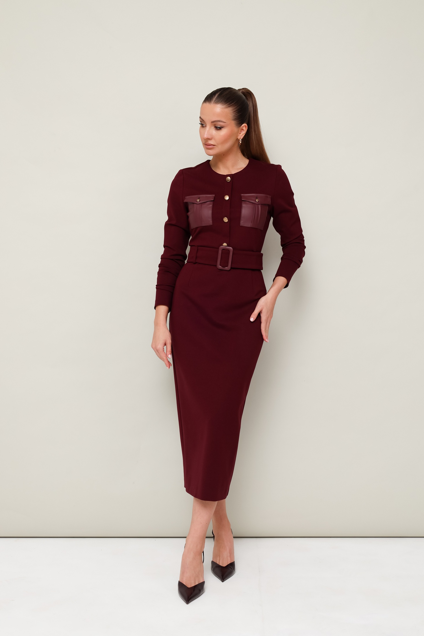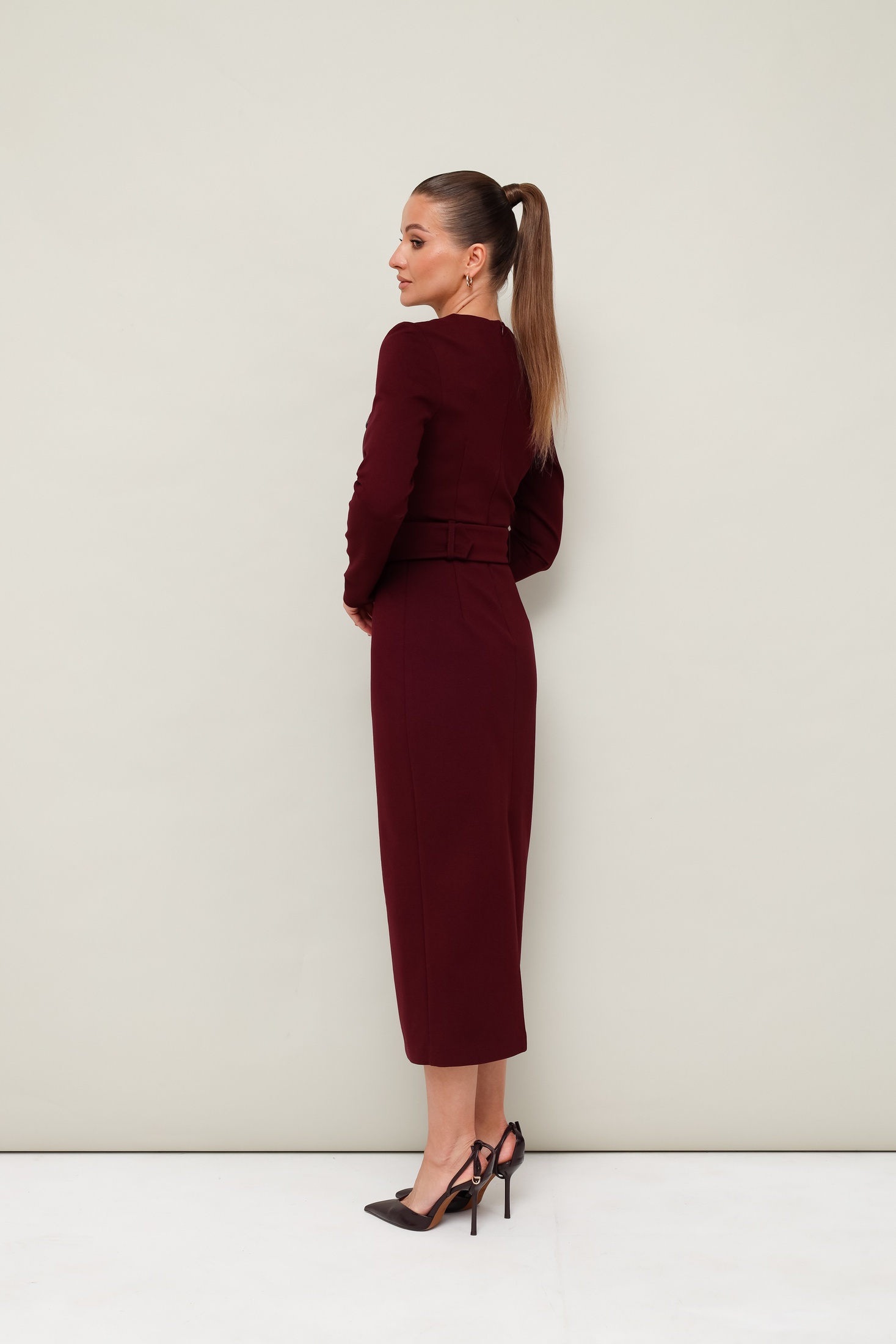 Платье прилегающего силуэта, отрезное по линии талии, выполнено из эластичного трикотажного полотна.