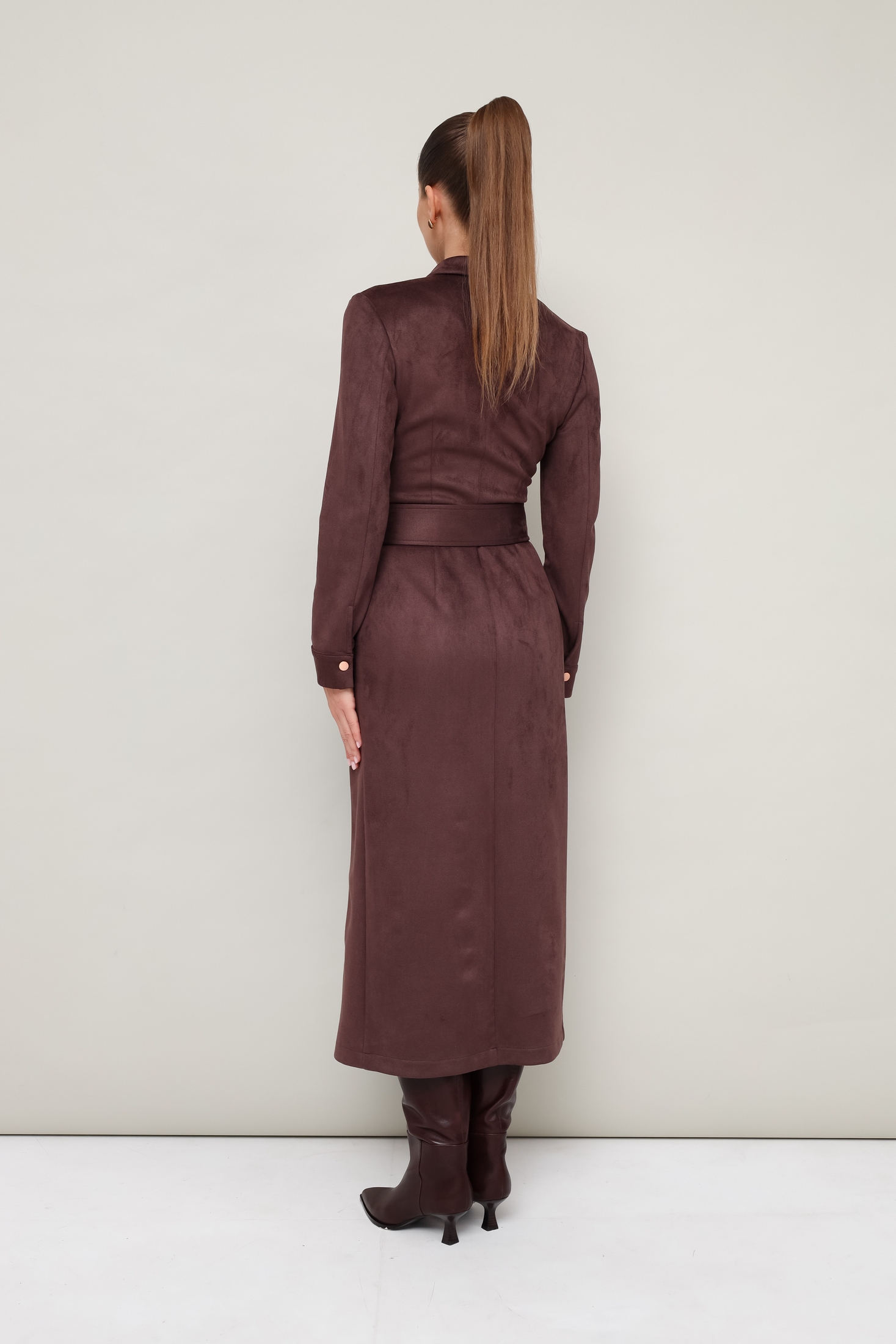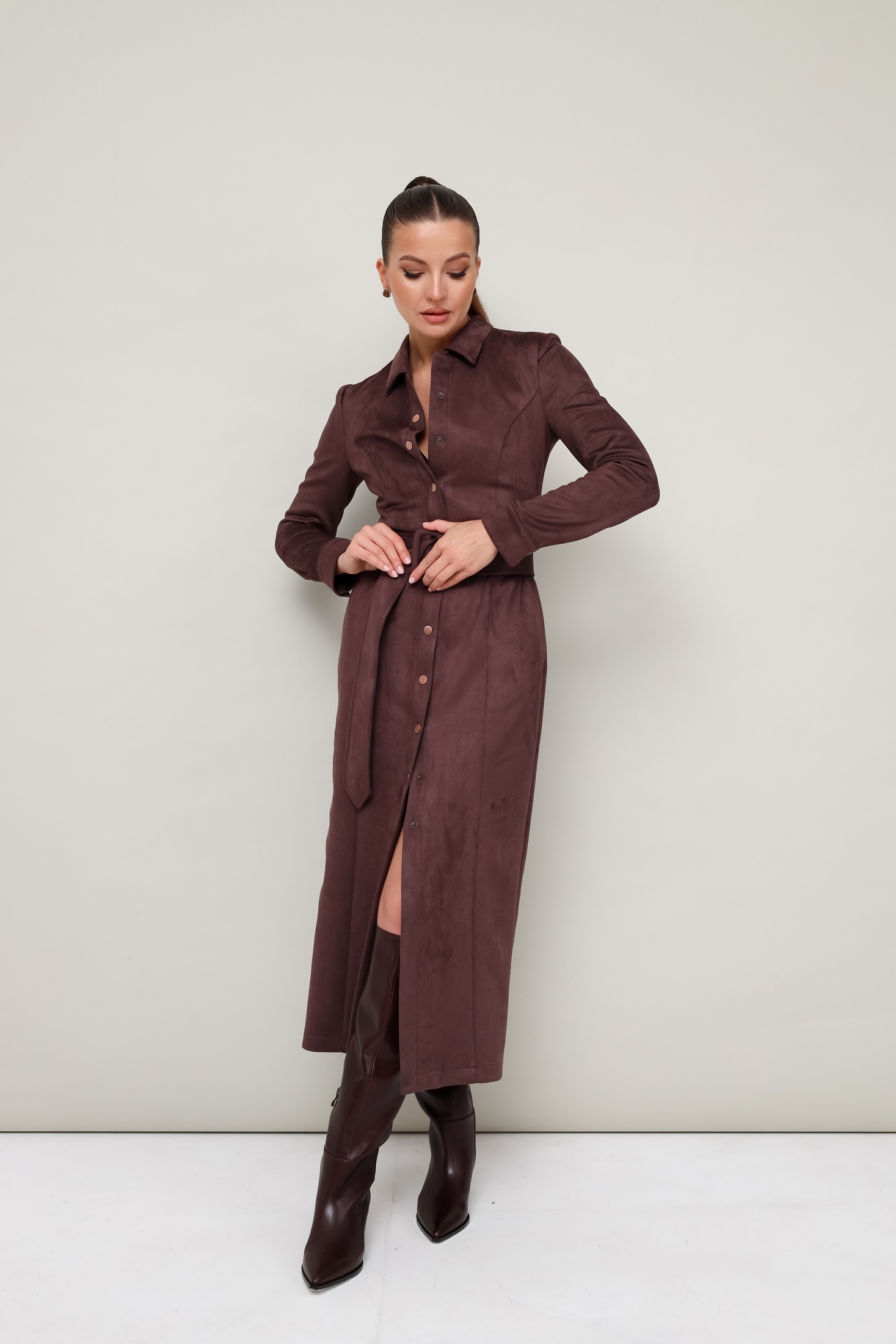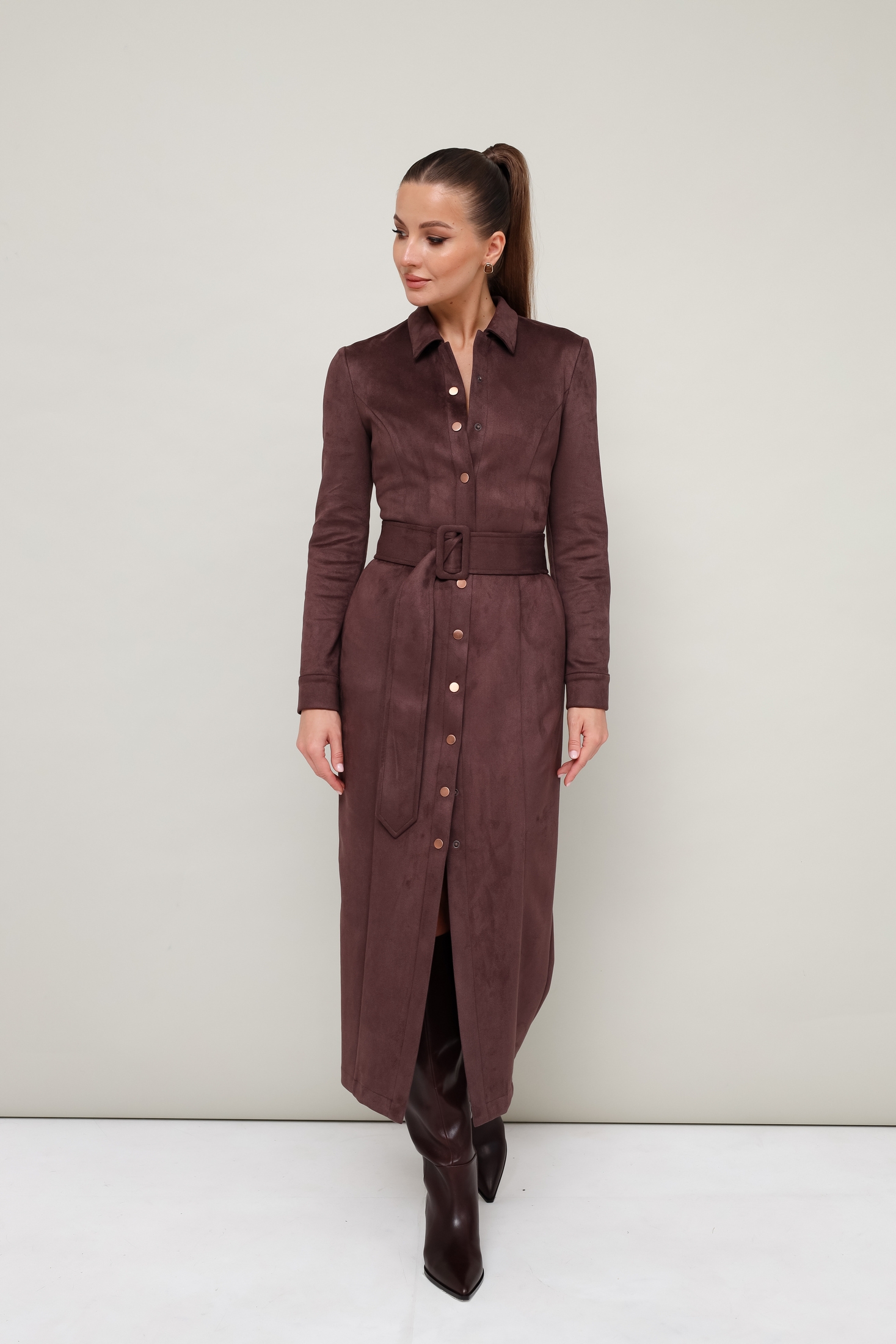 Платье 11-422-3 Pur Pur — идеальный выбор для стильных выходов. Коллекция бренда Pur Pur предлагает силуэтное платье миди, выполненное из экозамши, обладающей мягкостью и долговечностью. Отложной воротник с цельнокроеной стойкой придаёт завершённый вид, а центральная застёжка на кнопки добавляет удобства. Рукава с манжетами и рельефные швы создают элегантный образ. Дополните образ поясом из основной ткани для акцента на талие. Платье выполнено в классическом коричневом цвете и идеально подходит для осеннего и весеннего сезонов, будь то на работу или для повседневной носки.