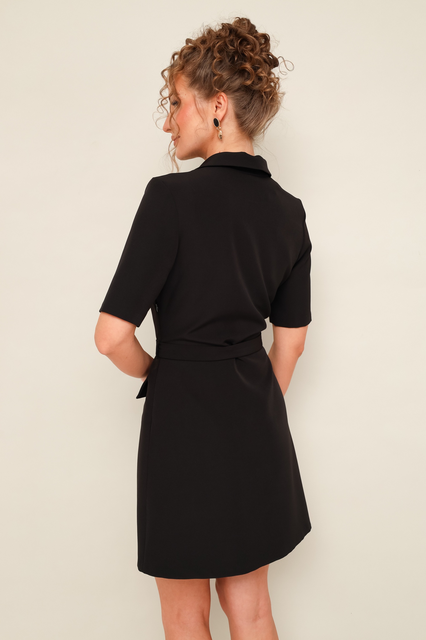 Платье отрезное по линии талии, выполнено из плательной ткани. Горловина с отложным воротником. Лиф с центральной застёжкой на петли и пуговицы. Втачные короткие рукава. Юбка А-образного силуэта, с центральной встречной складкой и с накладными клапанами с пуговицами. В комплекте съемный пояс с пряжкой. По талиии предусмотрены шлевки.