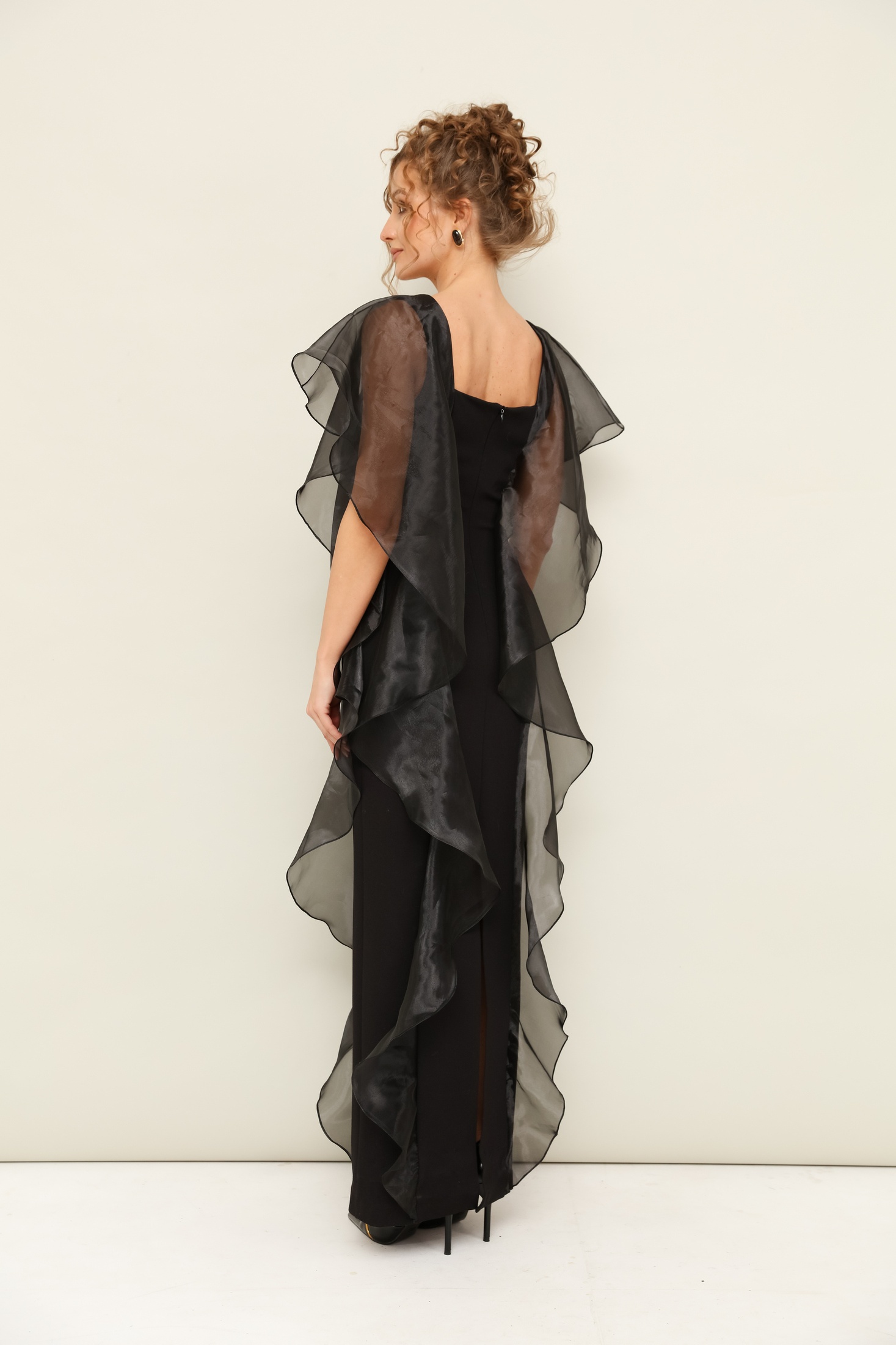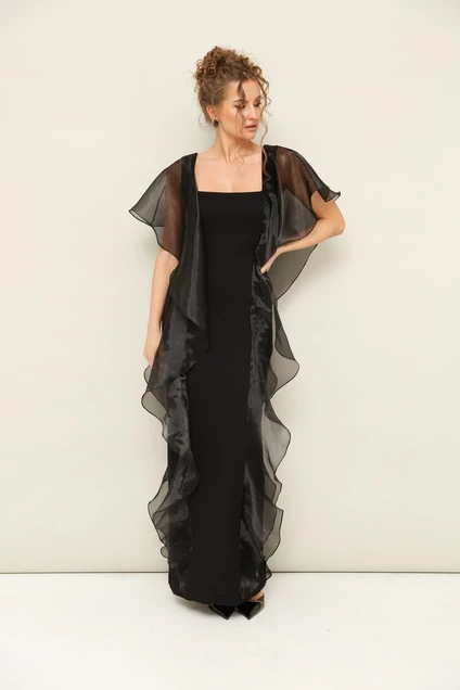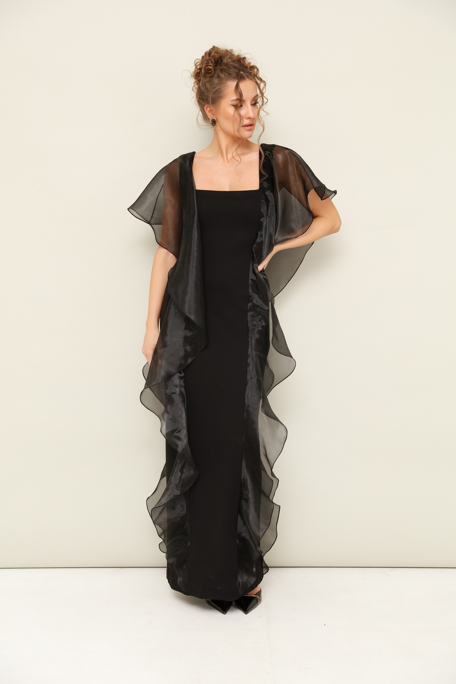Элегантное вечернее платье макси черного цвета подчеркивает изысканность и торжественность образа. Модель выполнена из комбинации мягкого трикотажа и лёгкой органзы, создавая стильное противопоставление текстур. Прямой силуэт платья дополнен оригинальными рельефами на передней и задней части, украшенными романтическими воланами из органзы, придающими наряду изысканную динамику. Вырез горловины «каре» открывает плечи и акцентирует внимание на зоне декольте. Застежка на потайную молнию, расположенная по среднему шву спинки, обеспечивает идеальную посадку и гармонично вписывается в общий дизайн изделия, переходя в элегантный шлиц, который добавляет простор для движения и визуально удлиняет силуэт. Такое платье идеально подойдет для вечерних мероприятий, где требуется особая торжественность и шик.