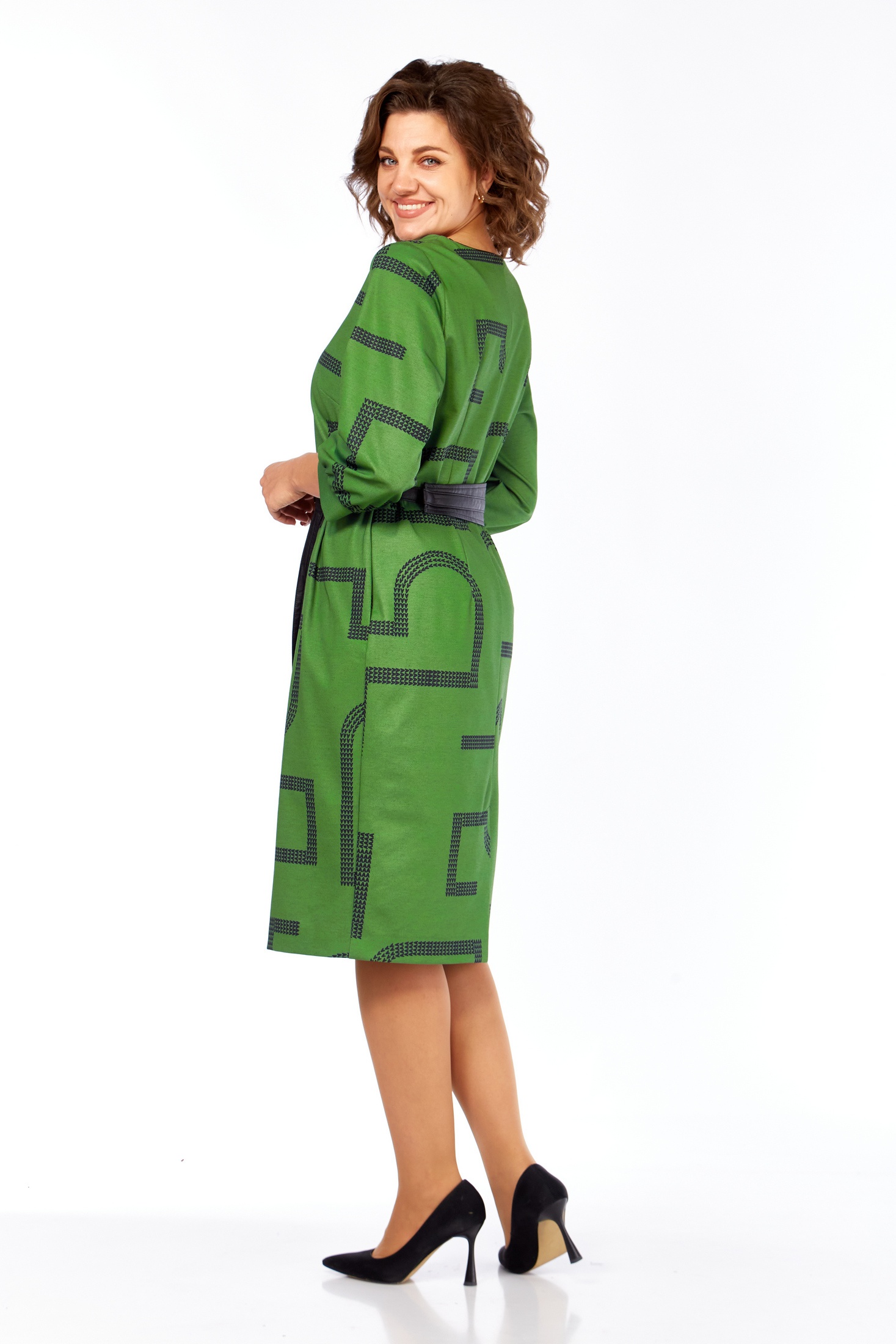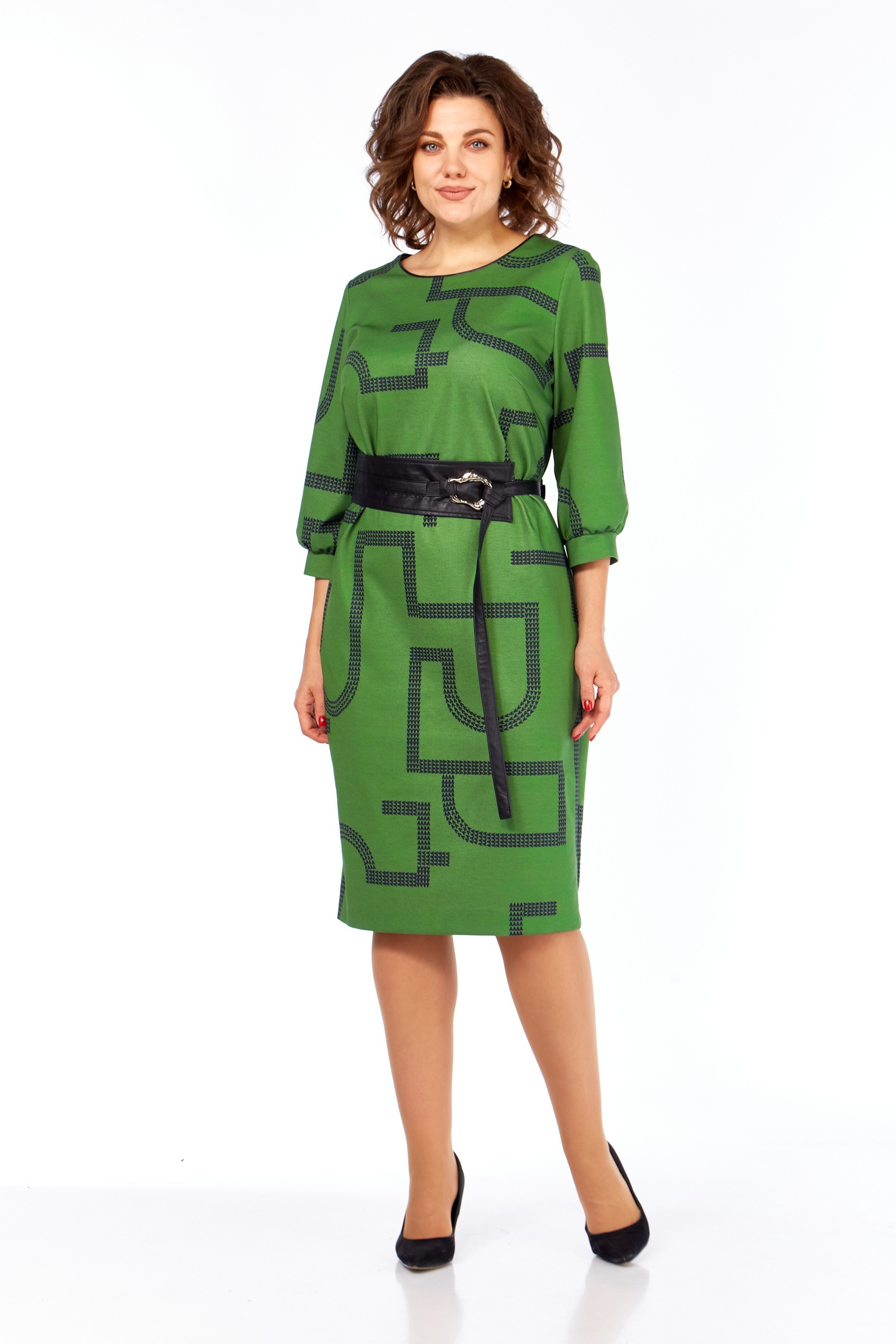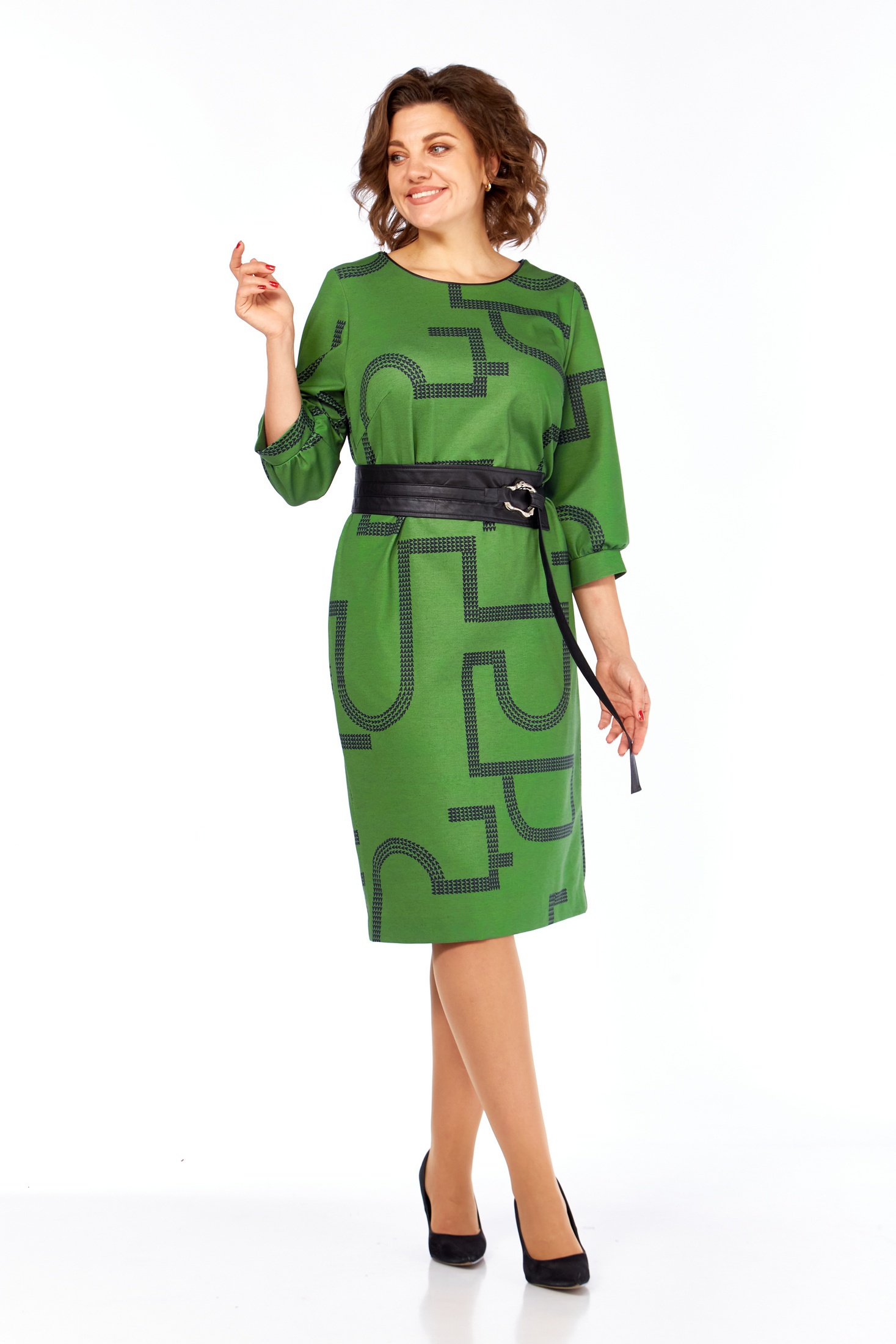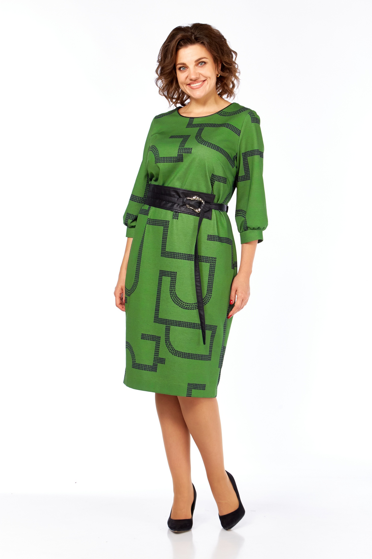 Платье женское прямого силуэта выполнено из высококачественного трикотажного полотна с дизайнерским принтом. В боковых швах имеются функциональные карманы. Перед с округлым вырезом, оформлен кожаным кантом. Спинка прямая со средним швом. Рукав одношовный втачной длиной ¾. В комплекте идет кожаный съемный пояс.
