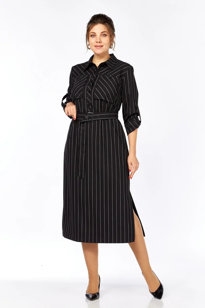 Платье-рубашка в полоску. Модное платье-рубашка из плательно-костюмной ткани в изысканную полоску — идеальное сочетание шика и современности. Универсальная длина и разрезы по боковым швам придают образу лёгкость и динамику, а пояс выгодно подчёркивает линию талии, создавая женственный силуэт.