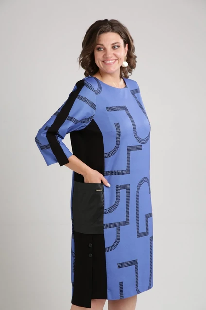 Горловина округлая. Спинка платья прямая со средним швом. Рукав одношовный втачной, длиной 3/4, с настрочным лампасом.