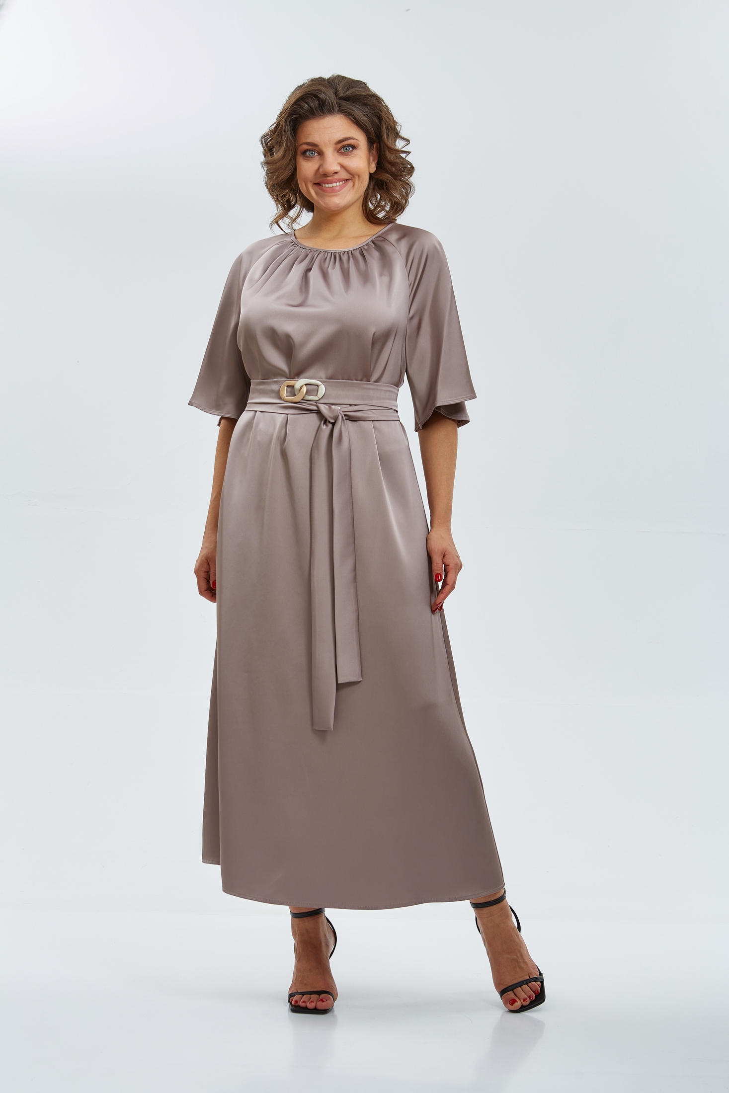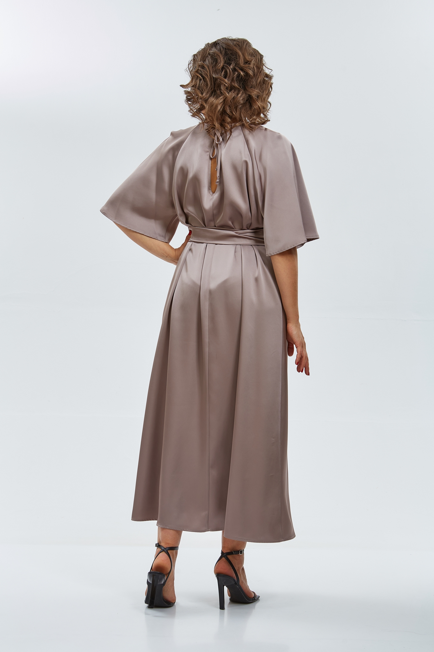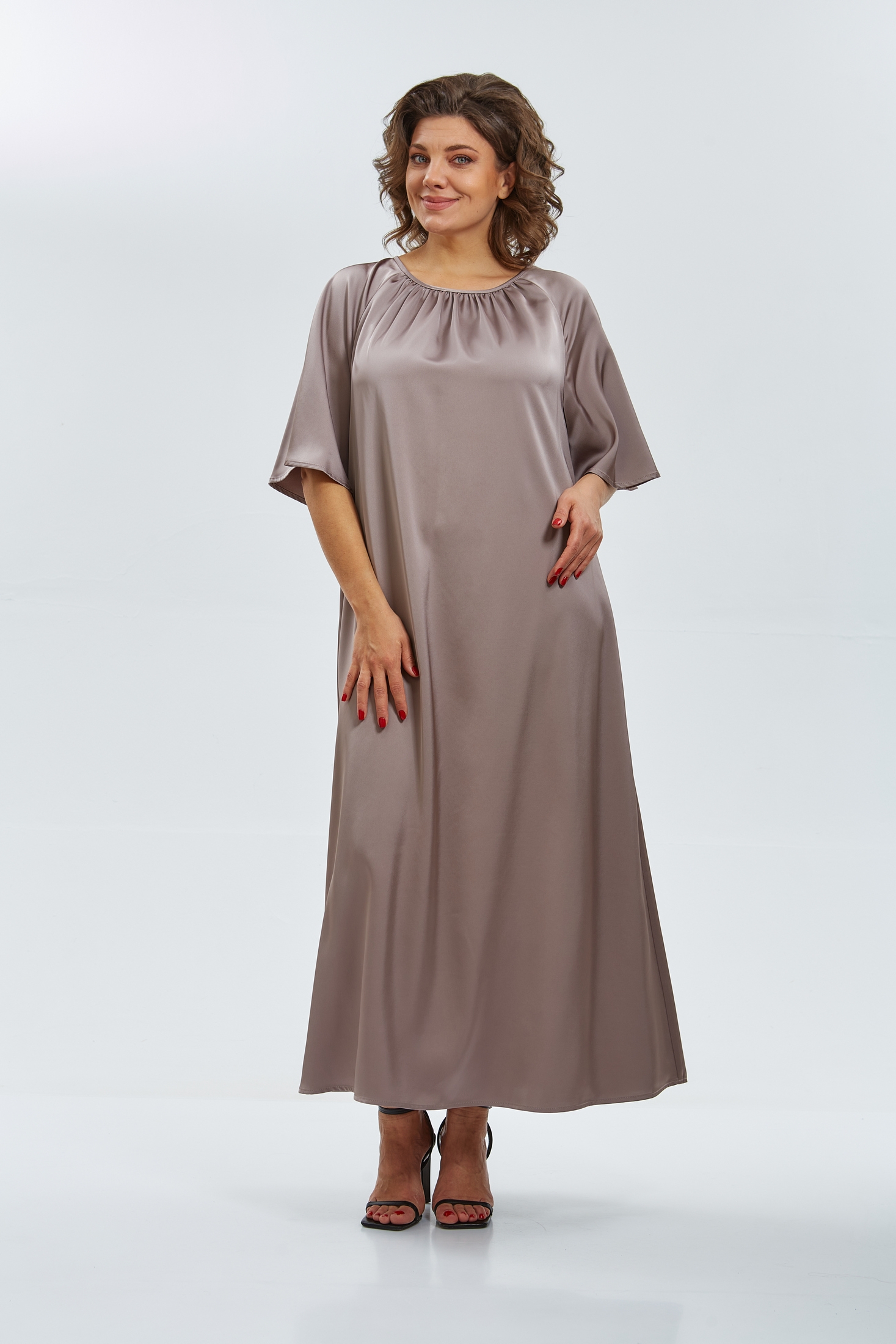 Элегантное макси-платье из двустороннего сатина воплощает утончённость и изысканность. Минималистичный крой подчёркивает плавность силуэта, а округлый вырез горловины со сборкой спереди добавляет мягкости образу. Рукава реглан, расширяющиеся к низу, создают воздушное движение ткани при каждом шаге.