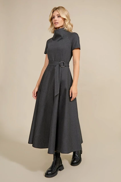 Роскошное длинное платье из плотного трикотажного полотна. Силуэт приталенный, отрезное по талии, с объемной юбкой А-образной формы. Рукав укороченный, типа реглан, оригинальный высокий цельнокроеный воротник-стойка. Потайная застежка-молния от горловины до талии по центру спинки. Талия подчёркнута поясом с застежкой на большое металлическое кольцо. ДЛИНА ИЗДЕЛИЯ 128 СМ.