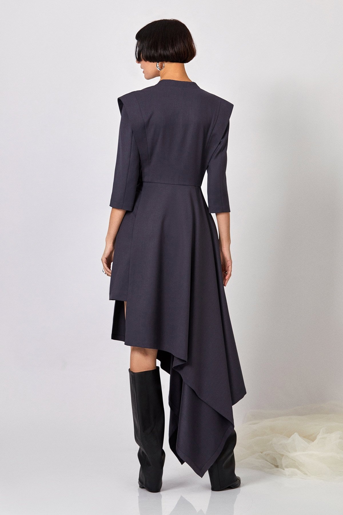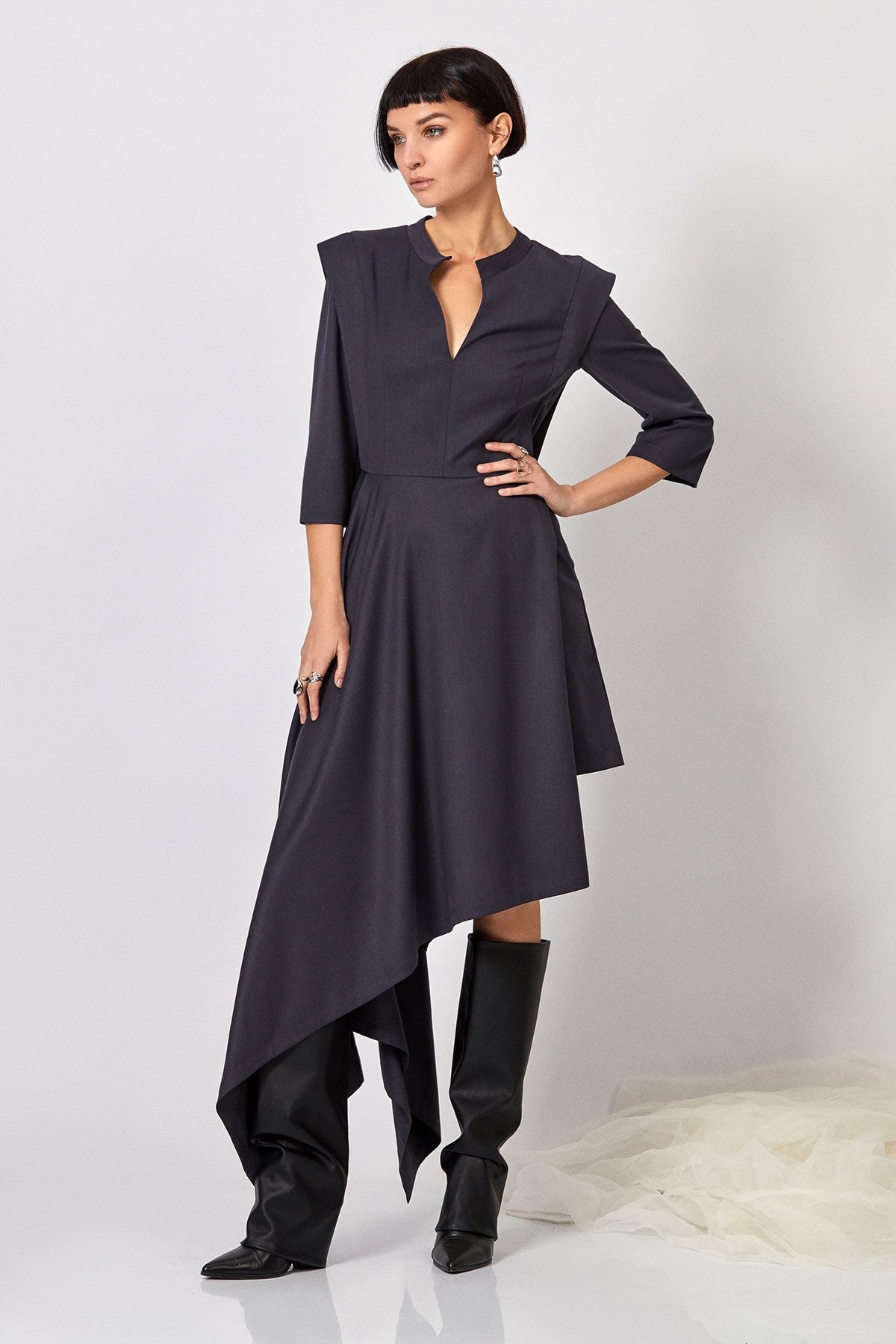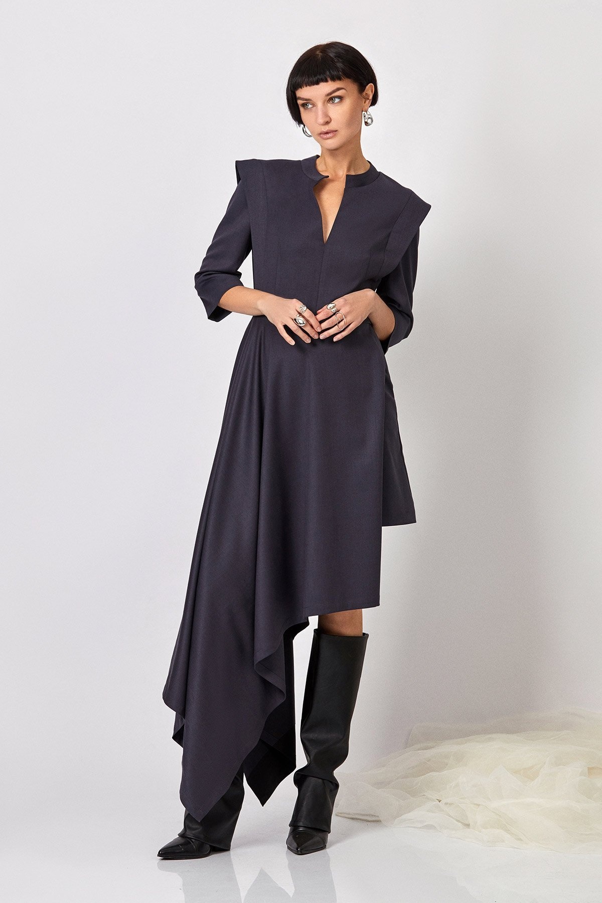- асимметричный низ со складками от талии и высоким разрезом в левом боковом шве до линии талии