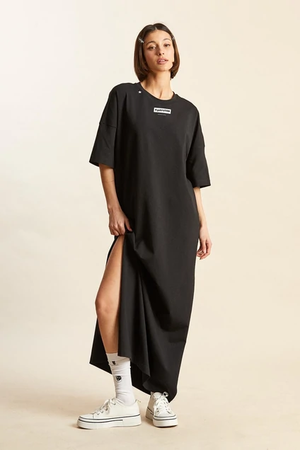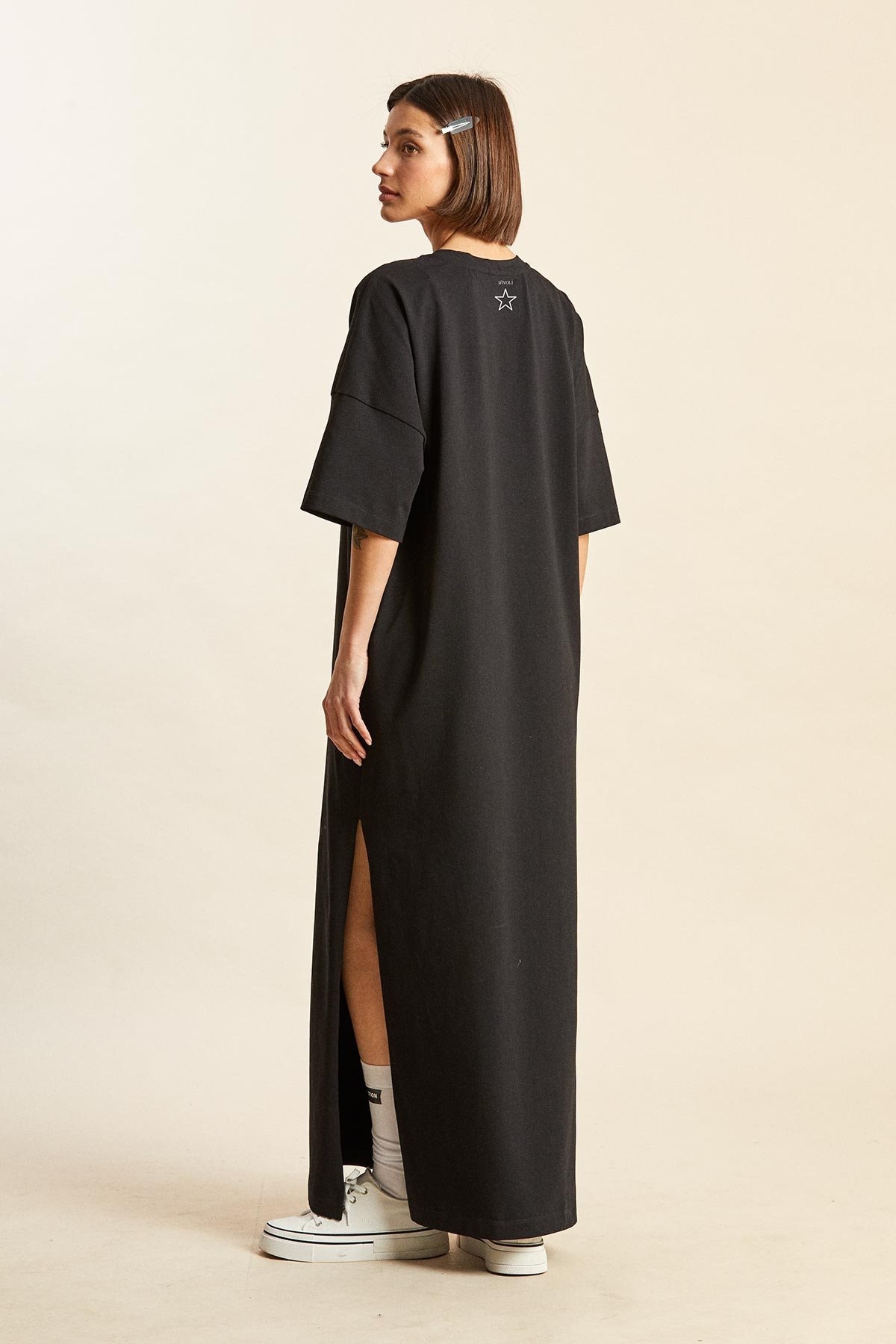 Платье 7199-1 черный Rivoli привлекает свободным силуэтом и макси-длиной, что делает его идеальным выбором для теплого времени года. Коллекция бренда Rivoli предлагает комфорт и стиль одновременно. Изготовленное из хлопка с добавлением эластана, это платье обеспечивает легкость и свободу движений. Спущенная линия плеча и рукава средней длины создают расслабленный образ. Круглый вырез горловины, обработанный планкой, и высокие разрезы по бокам добавляют оригинальности. Черный цвет и графические печати спереди, на спинке и рукавах делают его отличным выбором на каждый день и для вечеринок.