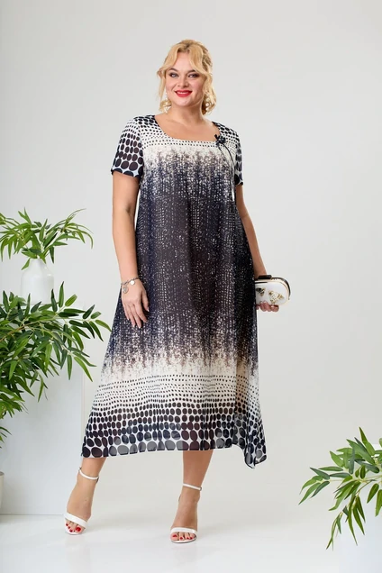 Платье женское А-силуэта, длинное, предназначено для повседневной носки. Перед цельнокроеный двумя нагрудными вытачками. Спинка цельнокроеная. Рукав короткий, одношовный. Горловина без воротника, круглая, обтачная. Перед платья декорируется пришивным украшением из ткани, в центре которого одна страза. Длина спинки 110 см. Длина рукава 16.5 см-18 см