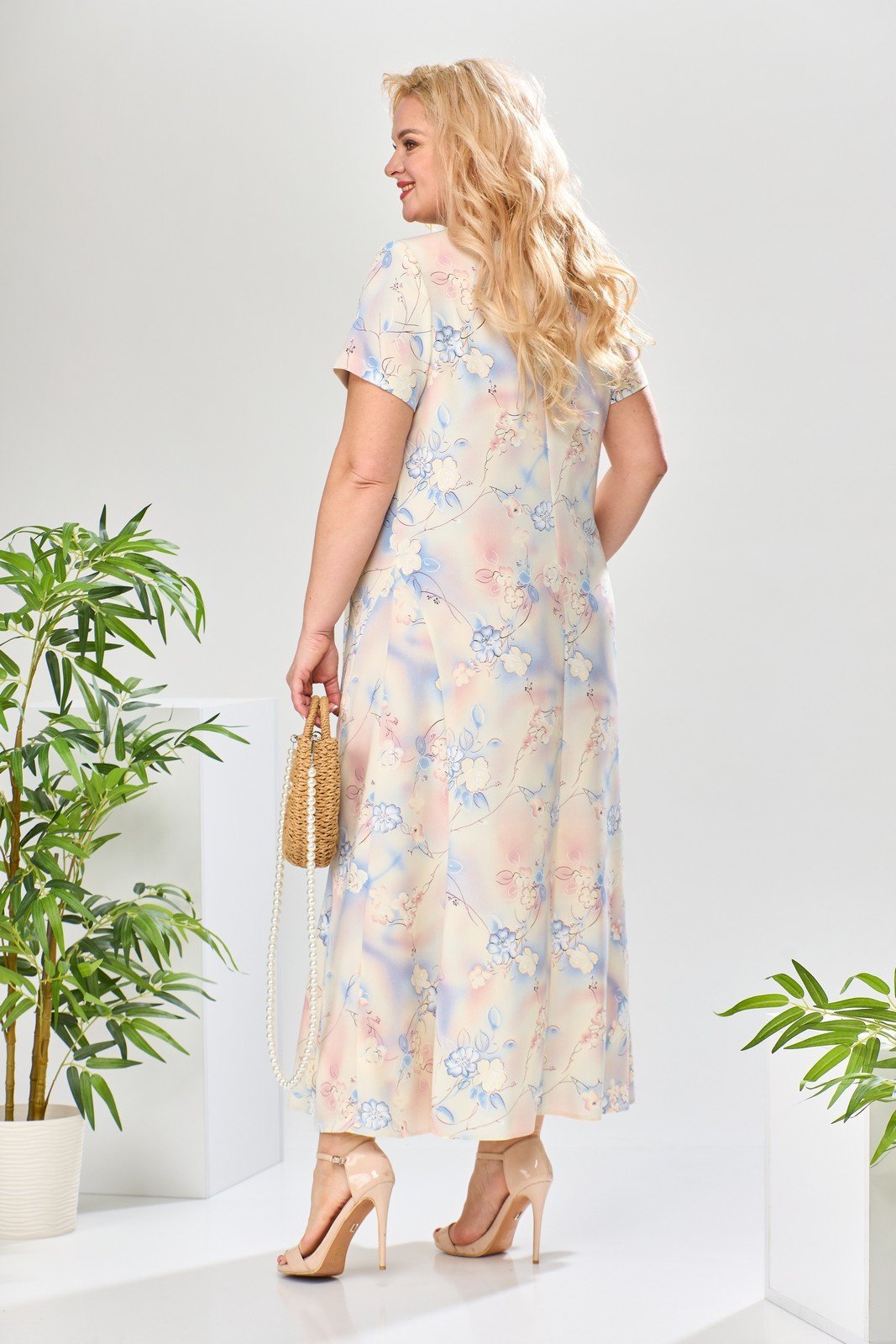 Платье женское предназначено для повседневной носки. Платье женское расширенное к низу, длинное. Перед с отрезной кокеткой, с двумя отрезными бочками, с двумя конструктивными подрезами внизу. Центральная часть переда с 8-ю декоративными складками. В швах соединения бочков с центральной частью переда обработаны карманы. Спинка со средним швом, с двумя декоративными конструктивными подрезами внизу от боковых швов. Горловина круглая, обтачная, без воротника. Рукав втачной, короткий, одно шовный. Ширина складки переда 1,5 см. Платье с плечевыми накладками. Длина спинки 133 см. Длина рукава 22 см