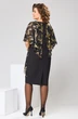 Платье женское относится к нарядной торжественной одежде. Платье полуприлегающего силуэта, с отлетной накидкой длиной за колено. Перед с двумя нагрудными вытачками, с двумя талиевыми вытачками. Спинка с двумя талиевыми вытачками и средним швом, заканчивающимся шлицей. Застежка на потайную тесьму-молнию в среднем шве спинки. Горловина круглая, обтачная, без воротника, по горловине закреплена накидка. Слева на уровне линии талии отделочным хлястиком, декорированным тесьмой накидка закрепляется на платье, нижняя часть накидки закреплена в левом боковом шве. Накидка с фигурным низом. Платье без рукавов. Длина спинки 103 см. Длина накидки от горловины 38 см