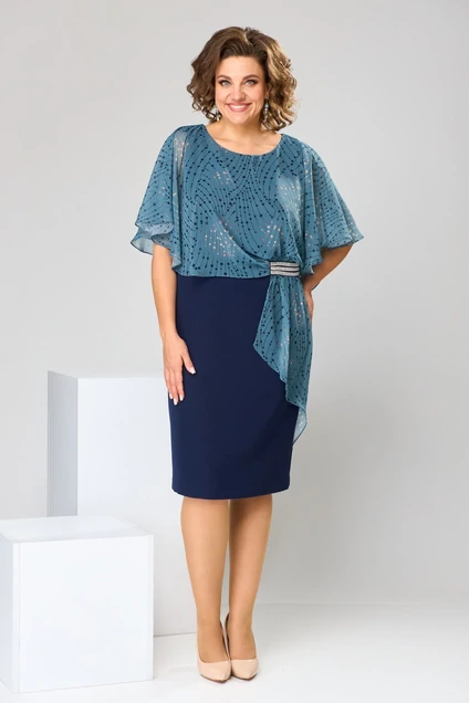 Платье женское относится к нарядной торжественной одежде. Платье полуприлегающего силуэта, с отлетной накидкой длиной за колено. Перед с двумя нагрудными вытачками, с двумя талиевыми вытачками. Спинка с двумя талиевыми вытачками и средним швом, заканчивающимся шлицей. Застежка на потайную тесьму-молнию в среднем шве спинки. Горловина круглая, обтачная, без воротника, по горловине закреплена накидка. Слева на уровне линии талии отделочным хлястиком, декорированным тесьмой накидка закрепляется на платье, нижняя часть накидки закреплена в левом боковом шве. Накидка с фигурным низом. Платье без рукавов. Длина спинки 103 см. Длина накидки от горловины 38 см