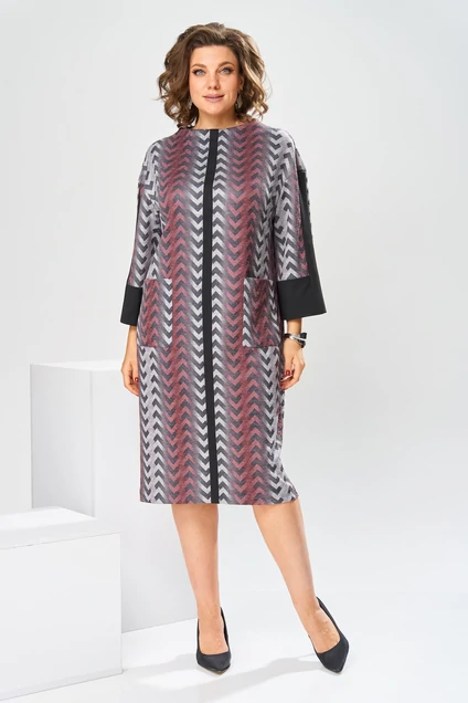 Платье женское для повседневной носки. Платье женское полу прилегающего силуэта, длиной за колено. Перед с 2-мянагрудными выточками, с 2-мя накладными прямоугольными карманами, на уровне линии бёдер, с приточной вертикальной планкой из отделочной ткани. Спинка со средним швом, заканчивающимся разрезом. Застёжка на потайную тесьму-молнию в среднем шве спинки. Горловина с цельнокроеной стойкой, обточная. Платье со спущенным плечом. Рукав втачной, длиной 7/8 с приточной манжетой из отделочной ткани и приточной вертикальной планкой из отделочной ткани по центру. Платье без плечевых накладок. Длина спинки 107 см, длина рукава от горловины 61 см.
