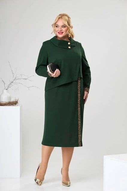 Платье женское предназначено для повседневной носки. Платье женское прямого силуэта длиной ниже колена на 12 см. Платье выполнено из трикотажного полотна с имитацией костюма. Верхняя часть платья отлётная. Перед с 1-ной нагрудной выточкой одним отрезным бочком слева. Из шва притачивания бочка формируется планка, зафиксированная отделочной строчкой шириной 3 см. Спинка верхней части цельнокроеная. Верхняя часть переда с фигурным низом. Нижняя часть переда с 2-мя талиевыми выточками, по левой стороне отделочная настроченная тесьма. Нижняя часть спинки с 2-мя талиевыми вытачками и средним швом, заканчивающимся шлицей. Горловина круглая с втачным фигурным воротником, декорированным 2-мя пришивными пуговицами. Рукав втачной, 2-х шовный, длинный, по низу настроченной отделочной тесьмой. Платье на подкладке. Платье с плечевыми накладками. Длина спинки 117 см, длина рукава 59 см.