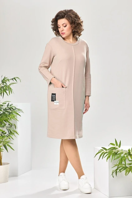 Платье женское прямого силуэта, длиной за колено. Перед с 2-мя нагрудными выточками, с отделочным защипом шириной 0,6 см по центру, с одним накладным прямоугольным карманом на уровне линии бёдер справа. Карман декорирован 2-мя надстрочными аппликациями. Спинка цельнокроеная, декорирована надстрочной отделочной тесьмой. Горловина круглая с втачной планкой. Платье со спущенным плечом. Рукав втачной, одно шовный, с декорированным вертикальным защипом по центру шириной 0,6 см. платье без плечевых накладок. Длина спинки 100 см, длина рукава 50 см, от горловины 61 см.