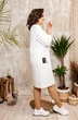 Платье женское прямого силуэта, длиной за колено. Перед с 2-мя нагрудными выточками, с отделочным защипом шириной 0,6 см по центру, с одним накладным прямоугольным карманом на уровне линии бёдер справа. Карман декорирован 2-мя надстрочными аппликациями. Спинка цельнокроеная, декорирована надстрочной отделочной тесьмой. Горловина круглая с втачной планкой. Платье со спущенным плечом. Рукав втачной, одно шовный, с декорированным вертикальным защипом по центру шириной 0,6 см. платье без плечевых накладок. Длина спинки 100 см, длина рукава 50 см, от горловины 61 см.