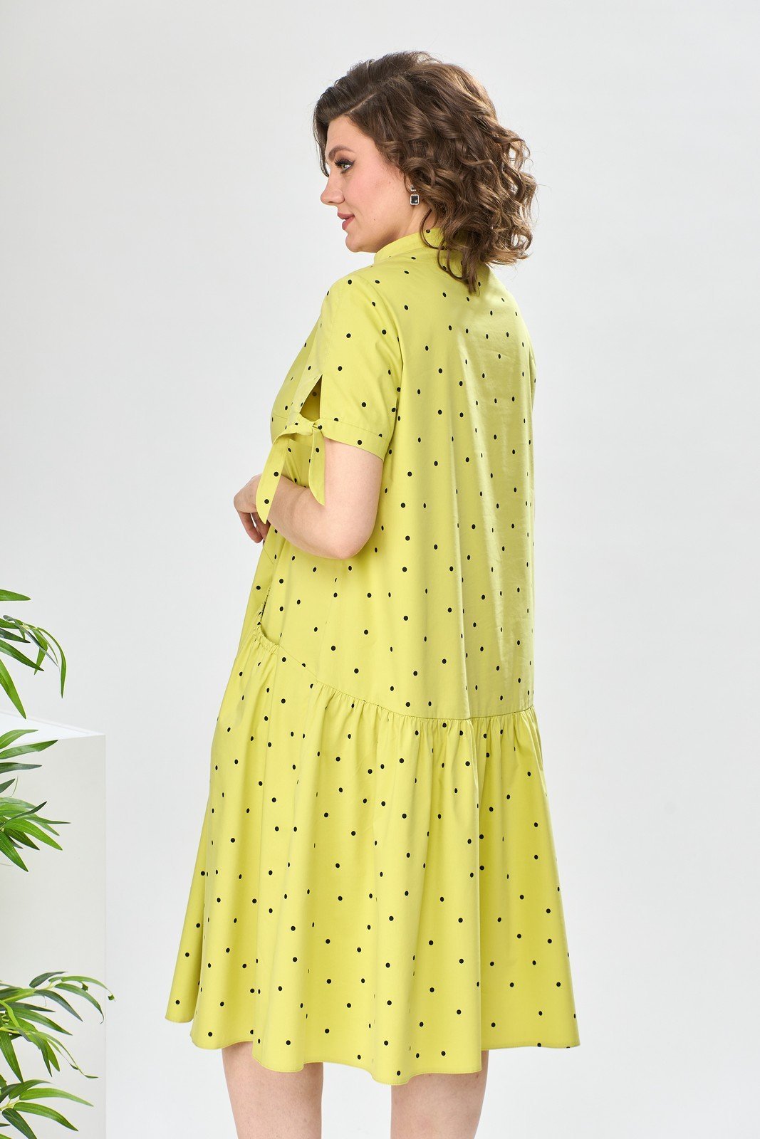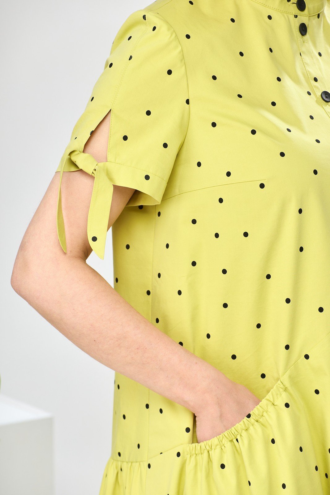 Платье для повседневной носки. Платье женское расширенное к низу, длиной за колено. Перед с 2-мя нагрудными вытачками с фигурным подрезом о линии талии до линии бёдер, в швах соединения подрезов обработаны карманы, собранные на эластичную тесьму. Перед с 2-мя приточными вертикальными планками по центру. Спинка с горизонтальным подрезом на уровне линии бёдер, верхний срез нижней части подреза со сборкой. Горловина круглая с втачной стойкой. Застёжка центральная на 5-тьобмётанных петель и 5-тьприштыных пуговиц. Рукав втачной, 2-х шовный, короткий. Верхний шов рукава с разрезом, низ с приточной манжетой, переходящей в завязки. Платье с плечевыми накладками. Длина спинки 109 см, длина рукава 22 см.