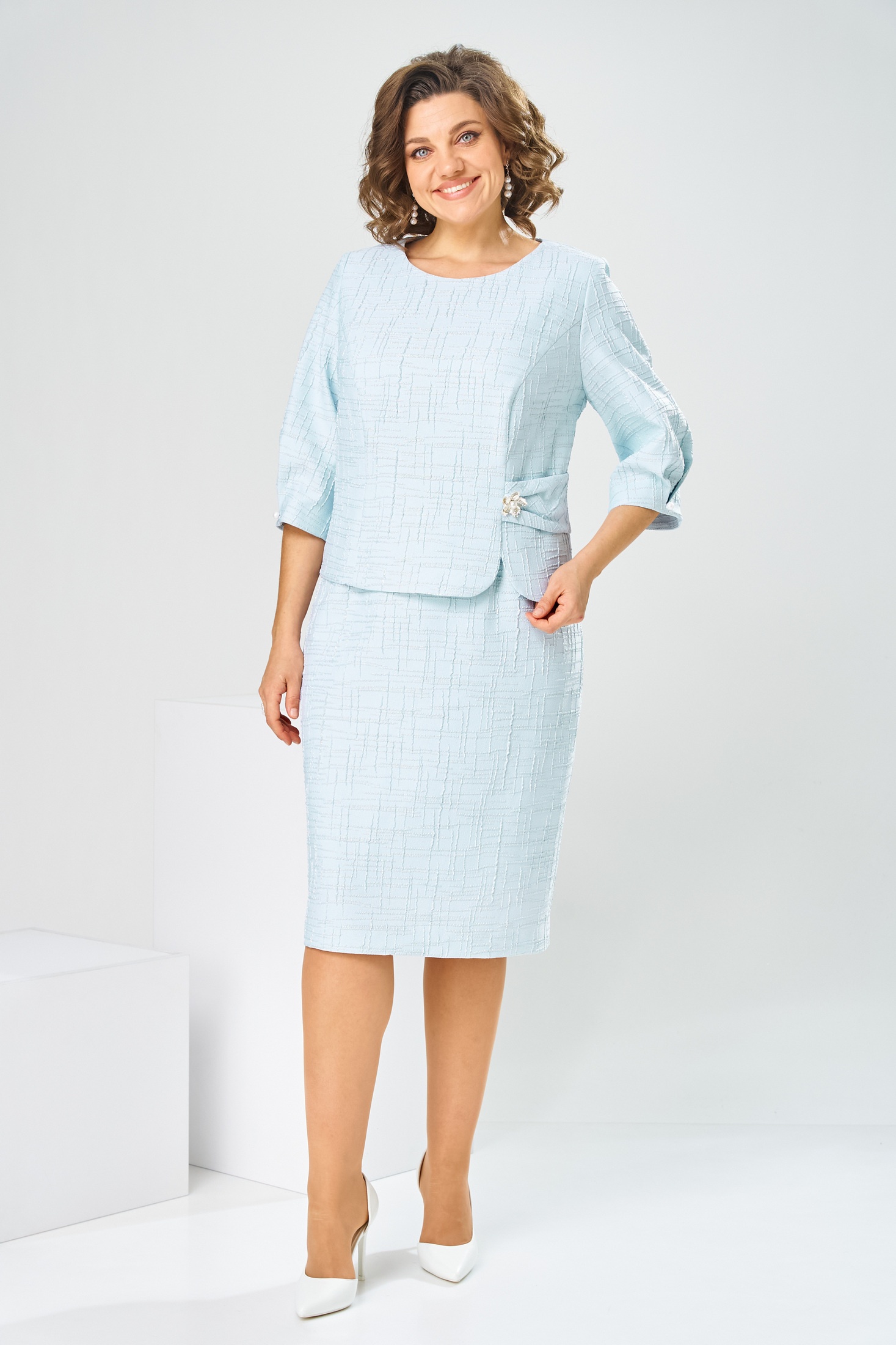 Платье 1-2537 голубой-1 Romanovich style — это изысканный выбор из коллекции бренда, который подчеркнёт вашу женственность в любом торжественном случае. Изготовлено из ткани с высоким содержанием полиэстера, с добавлением люрекса и эластана, что придаёт платью мерцающий блеск и эластичность. Полуприлегающий силуэт и имитация костюма создают элегантный облик. Дизайн включает в себя фигурный пояс с объёмным украшением и рукава длиной 3/4 с декоративной складкой и пуговицей. Нежно-голубой цвет делает эту модель отличным выбором для праздника или вечеринки. Застёжка на потайную тесьму-молнию облегчает процесс надевания. Длина спинки составляет 104 см, что делает его идеальным для весенних и летних мероприятий. Длина спинки 104 см, длина рукава 42 см.